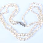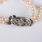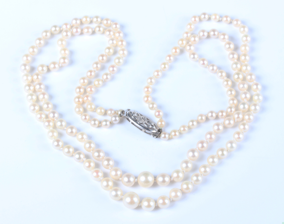 A two row necklace of graduated cultured pearls on a white gold snap clasp, detailed '9ct Lotus', length of shortest strand 40.5cm.