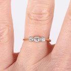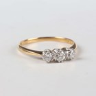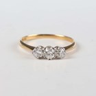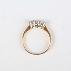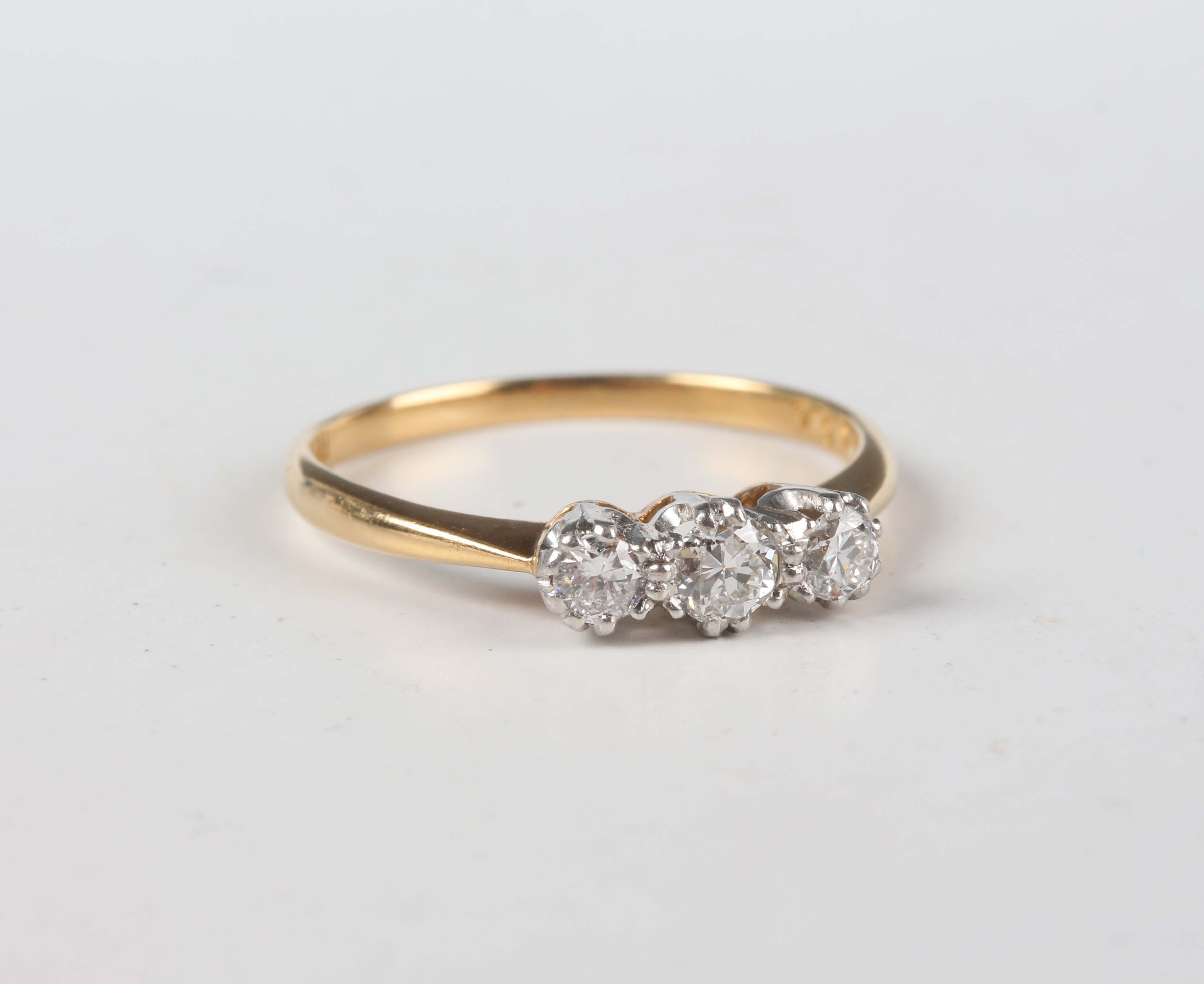 A gold and diamond three stone ring, claw set with a row of circular cut diamonds, detailed ‘18ct’, weight 2.2g, ring size approx L1/2.