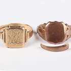 A 9ct gold rectangular signet ring, monogram engraved, ring size approx R, and another 9ct gold signet ring (incomplete and in two sections), total weight 9.4g.