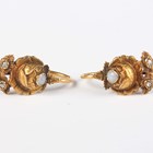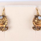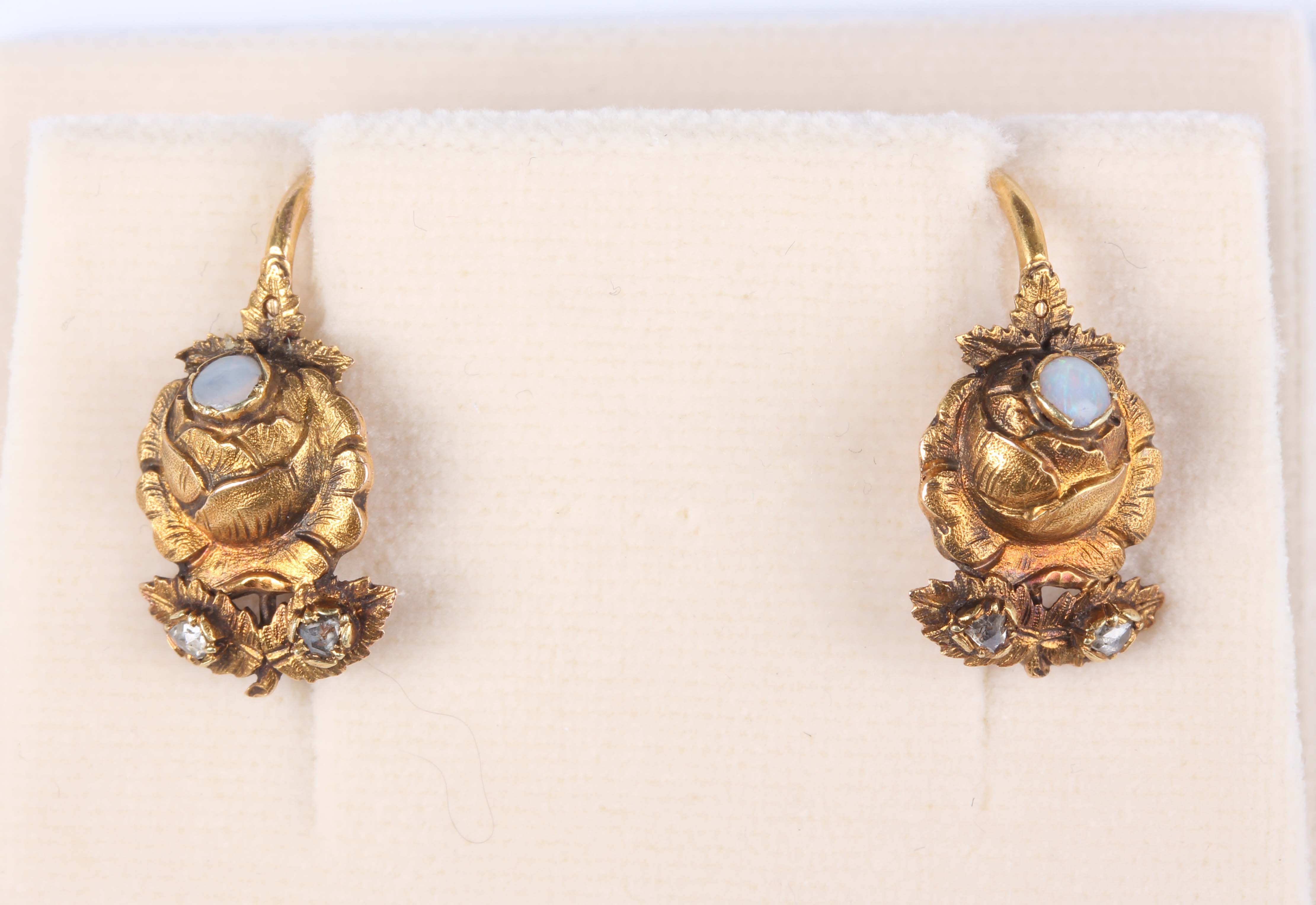 A pair of French gold, rose cut diamond and opal earrings, each designed as a flower, French marks to fittings, weight 3.1g, length 2.2cm, with an associated case.