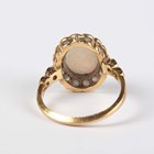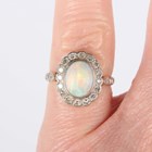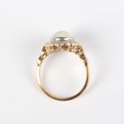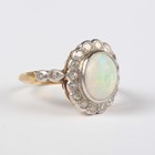 A gold, platinum, opal and diamond cluster ring, collet set with the oval opal within a surround of single cut diamonds, between diamond set shoulders, detailed ‘18ct Plat’, weight 3.6g, ring size approx K, with a case.