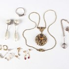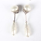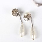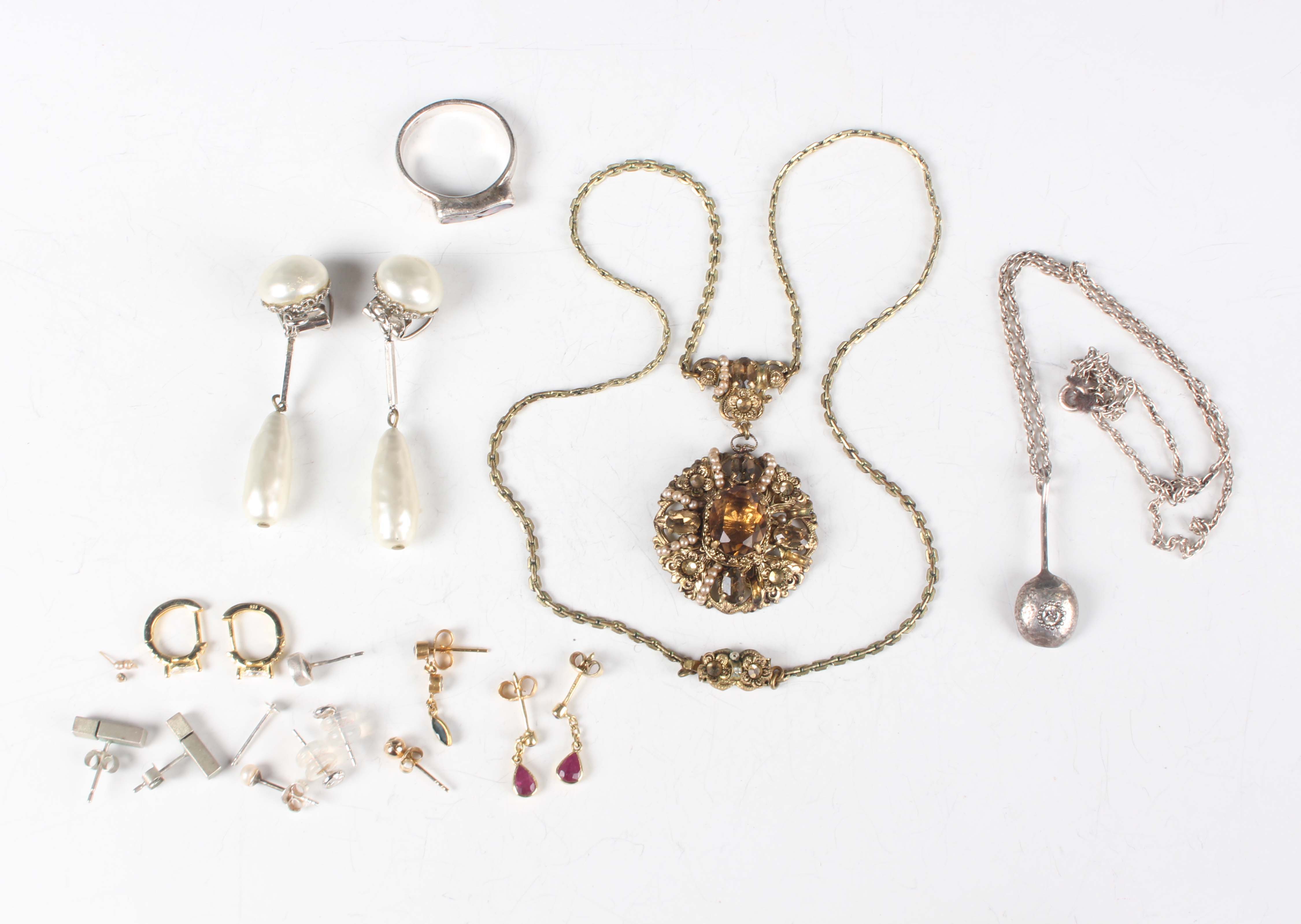 A small group of jewellery, including a pair of 9ct gold and pear shaped ruby single stone earrings, weight 0.7g, length 1.5cm, a pair of silver gilt and colourless gem set earrings, a colourless gem set pendant with a neckchain, a silver and opal ring, detailed ‘925’ (cracked), and a pair of imitation pearl pendant earclips, detailed ‘Made in France’.