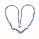 A single row necklace of graduated sapphire beads, the front with three 9ct white gold and diamond single stone divisions, mounted with circular cut diamonds, on a white gold sprung hook shaped clasp, length 47cm.