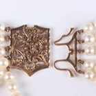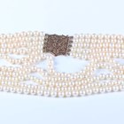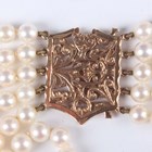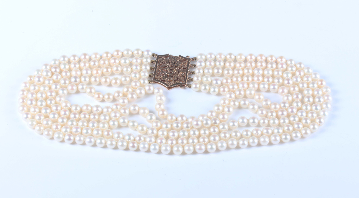 A five row necklace of uniform cultured pearls on a gold clasp with scroll pierced decoration, detailed ‘585’, total weight 106.8g, length of shortest strand 34cm, length of longest strand 43.5cm.