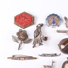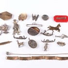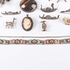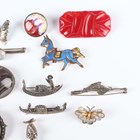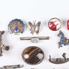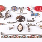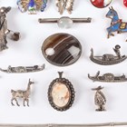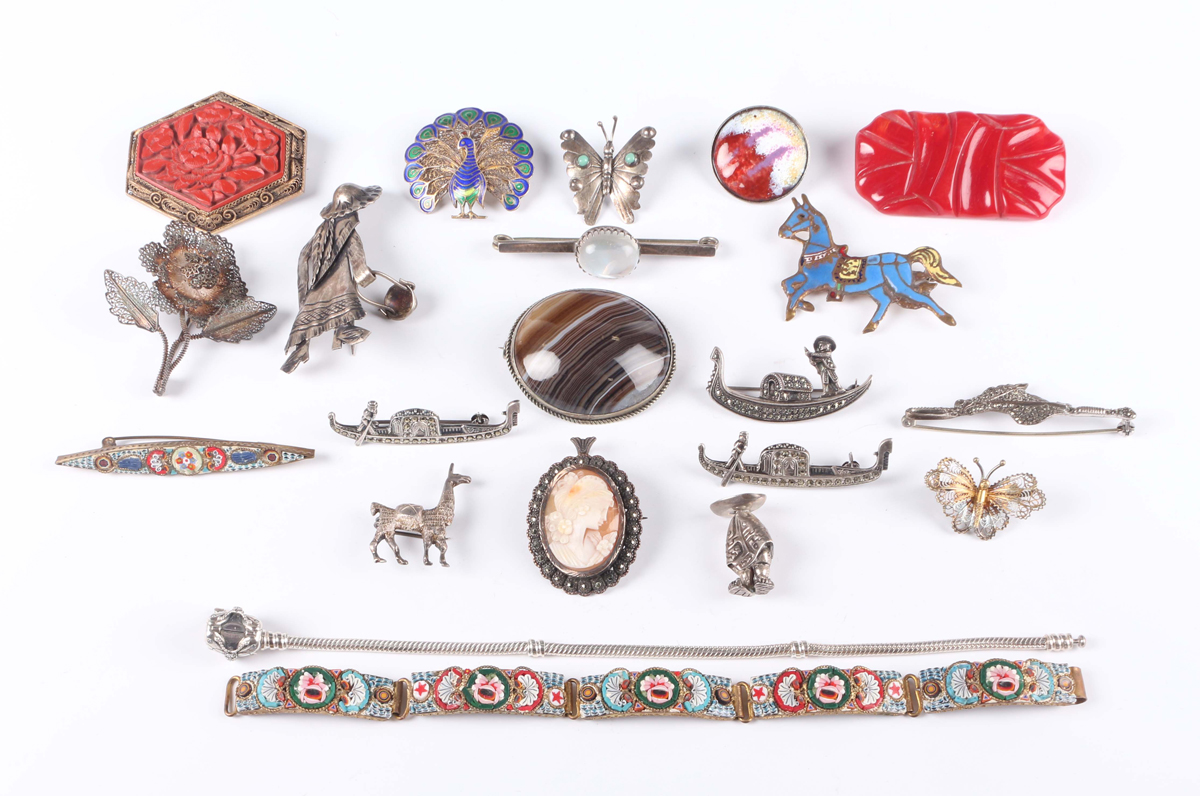 A group of nineteen brooches, including a moonstone single stone bar brooch, a banded agate oval brooch, a shell cameo and marcasite oval pendant brooch and three marcasite brooches, designed as gondolas, together with two bracelets.