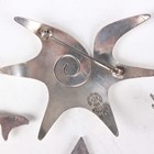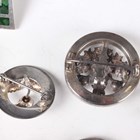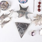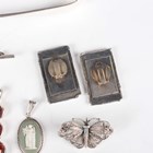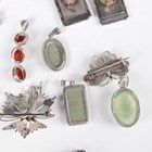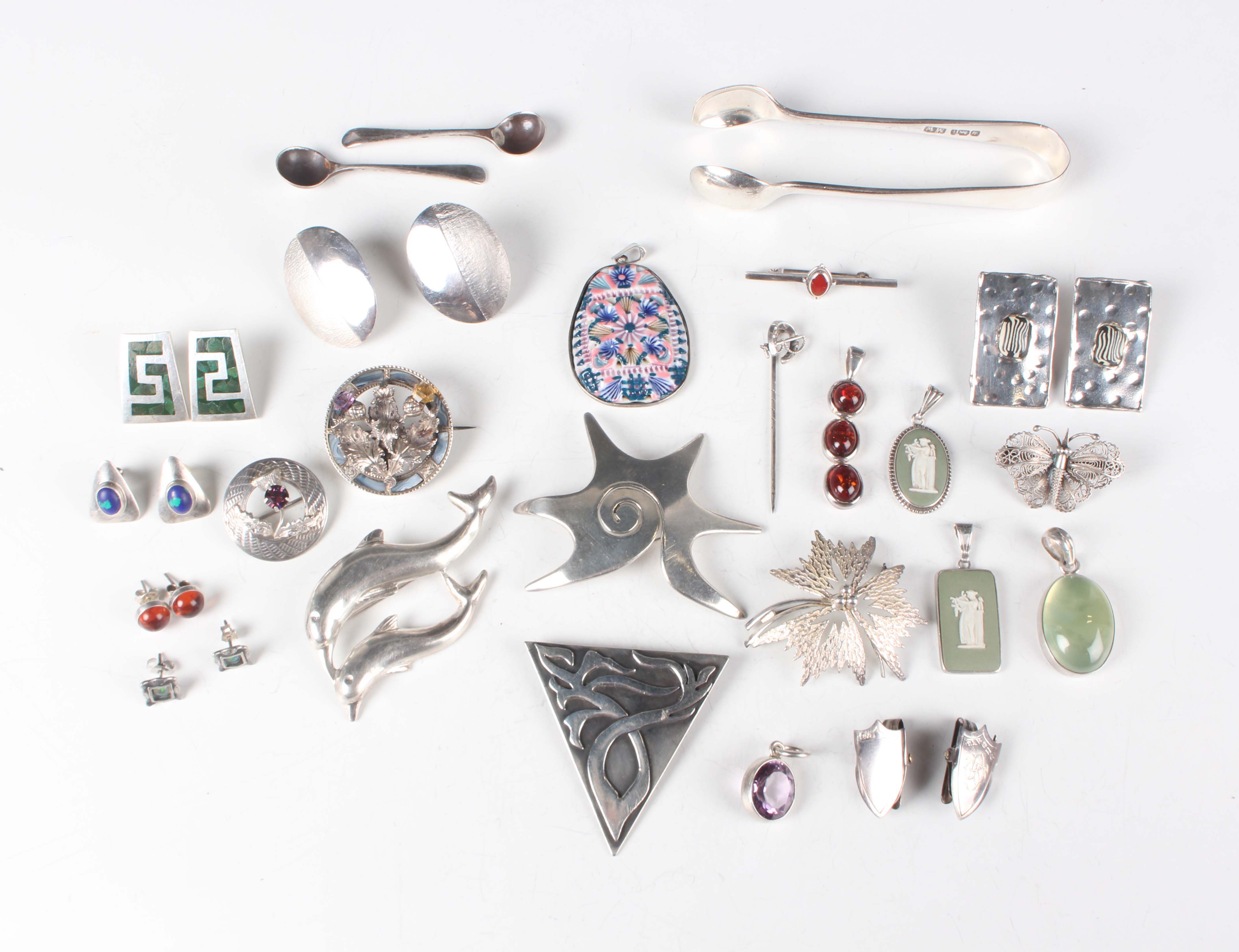 A group of silver and silver mounted jewellery, including a Scottish hardstone circular thistle brooch, unmarked, width 3.1cm, five further silver brooches in various designs, total weight 46.6g, five pairs of silver and gem set earrings and various pendants, together with a pair of silver sugar tongs, Sheffield 1901 by Mark Willis, and two silver condiment spoons, total weight 31.5g.
