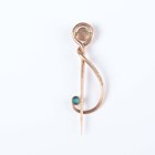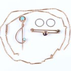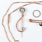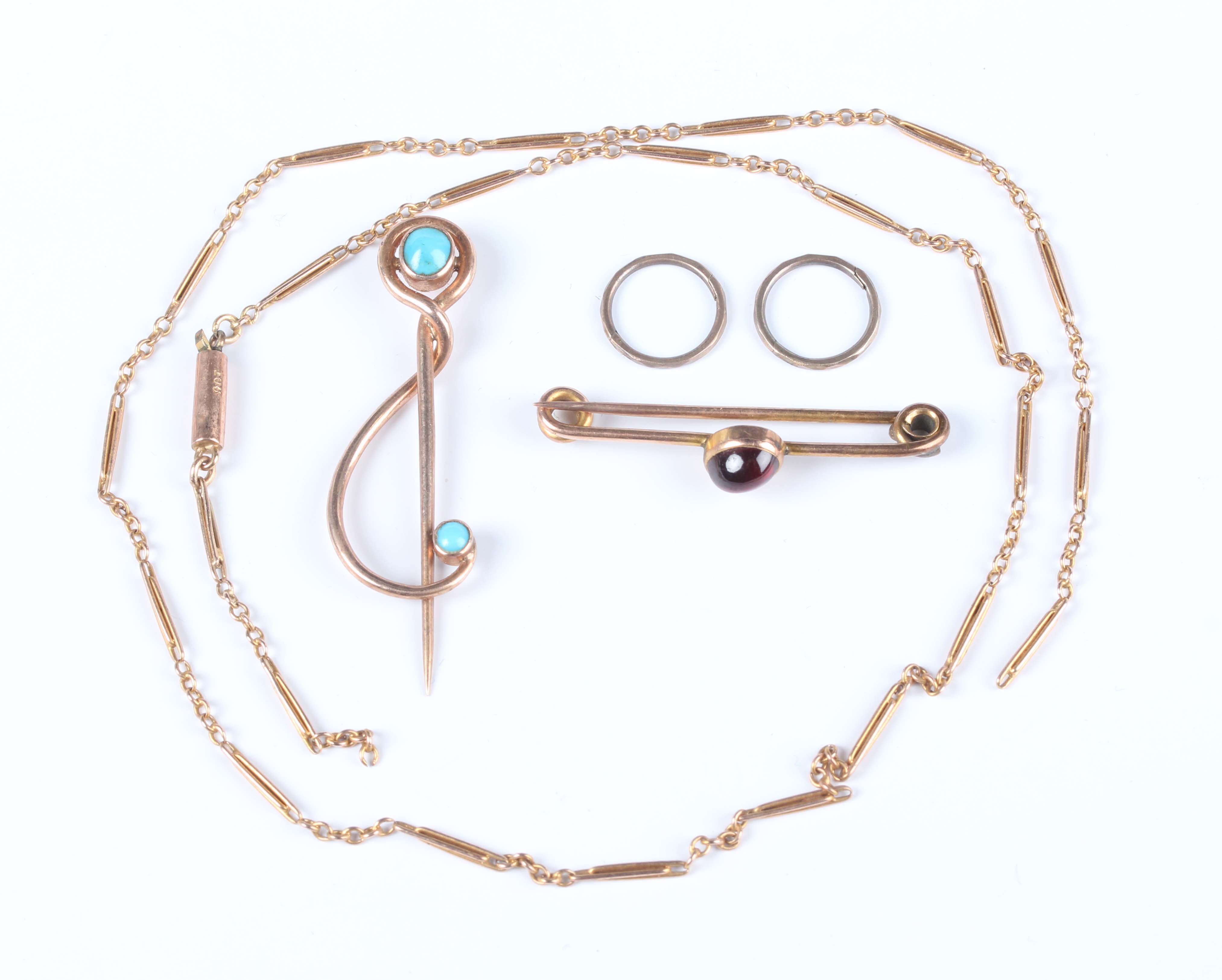 A Murle Bennett & Co gold and turquoise pin brooch, mounted with two turquoises, detailed ‘9ct Patent 7034.91’, length 5cm, a gold and carbuncle garnet bar brooch, unmarked, weight 2g, a gold twin bar and circular link neckchain on a cylindrical clasp, detailed ‘9ct’, weight 3.6g, and a pair of faceted circular sleepers.