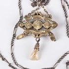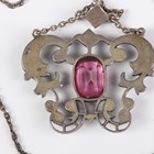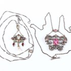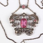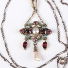 A silver gilt, garnet, blister pearl and enamelled pendant in the Renaissance style, probably Austro-Hungarian, unmarked, weight 5.5g, length 5cm, with a neckchain, length 70cm, and a French silver, pink paste and marcasite pendant necklace, weight 15.5g.