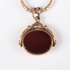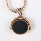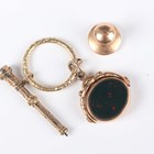 A Victorian 9ct gold mounted, bloodstone and cornelian oval rotating fob, Birmingham 1878, weight 9.4g, length 3cm, and a Victorian gilt metal slide action pencil with an imitation bloodstone terminal, both fitted to a split ring, together with a gold stud, detailed ‘15ct’, weight 3.3g.