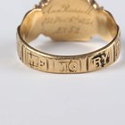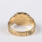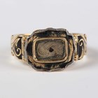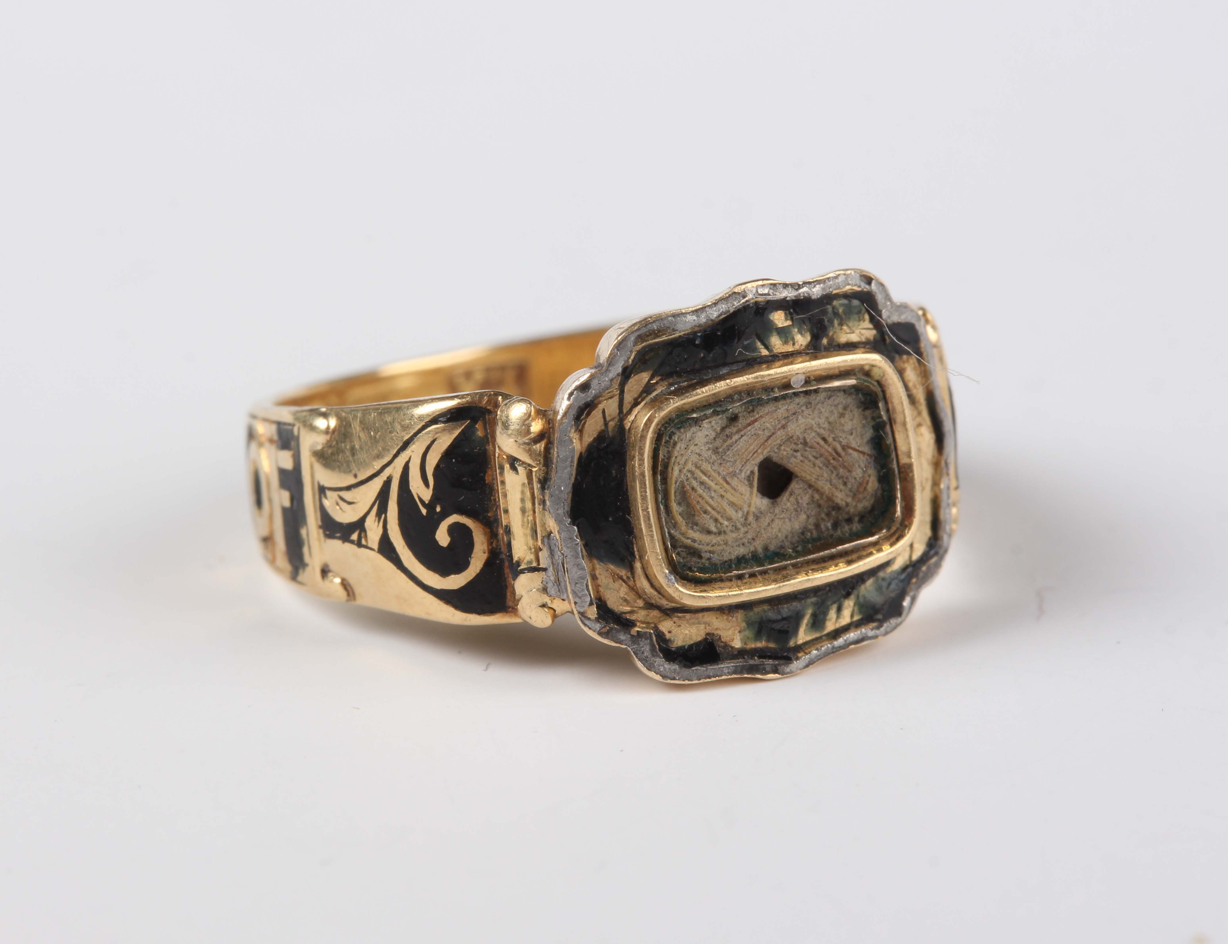 A late Victorian 18ct gold and black enamelled mourning ring, detailed ‘In Memory Of’, glazed with a hair locket compartment, Birmingham 1897, weight 3.8g, ring size approx L (the glazing lacking).
