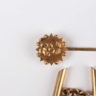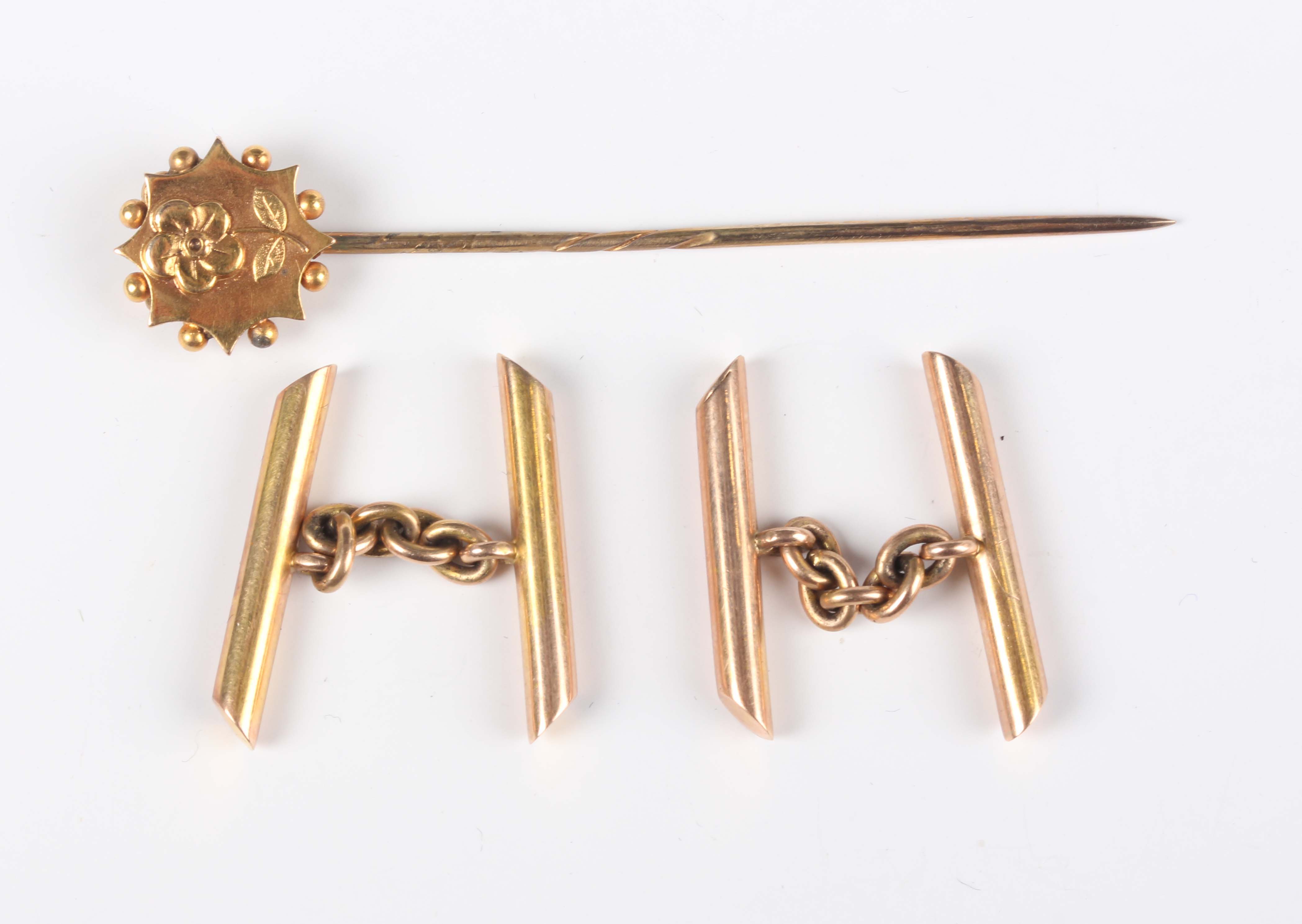 A pair of bar form cufflinks, unmarked, weight 4.6g, dimensions of each front 2.2cm x 0.3cm, and a gold stickpin, the finial decorated with a flower motif, unmarked, weight 1.8g, with two cases.