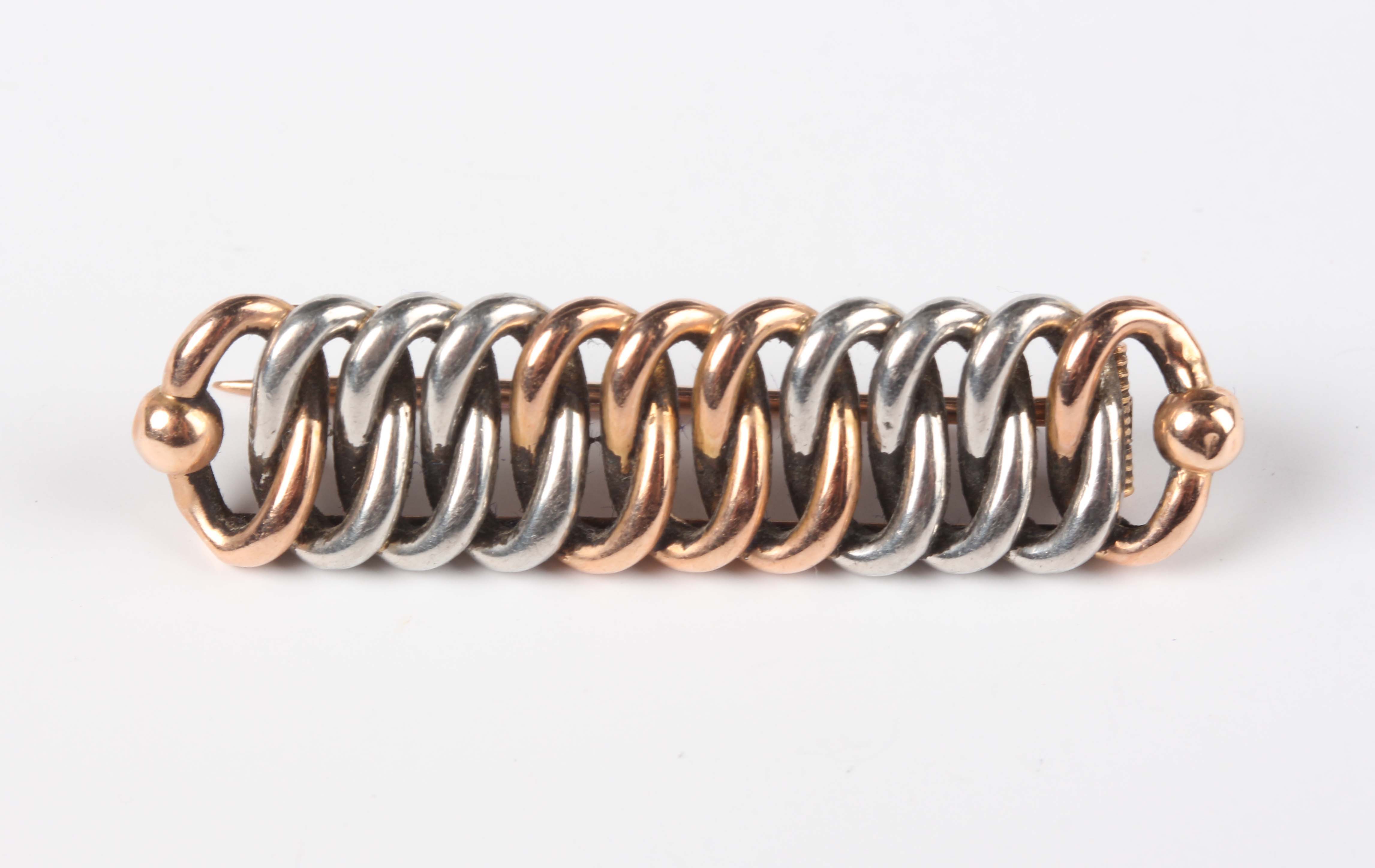 A two colour gold bar brooch in a chain link design, detailed ‘15’, weight 6.3g, width 4.2cm, with a case.