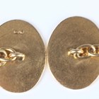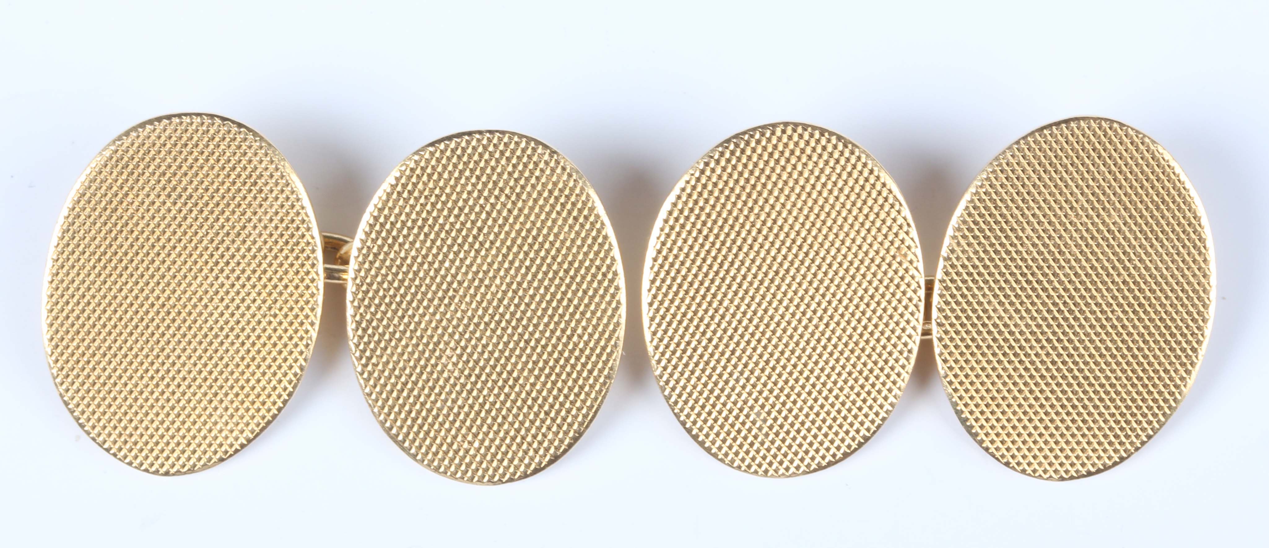 A pair of 18ct gold oval cufflinks with engine turned decoration, Birmingham 1947, weight 10.9g, dimension of each front 1.8cm x 1.3cm.