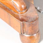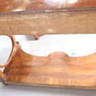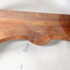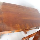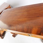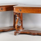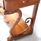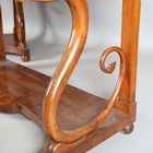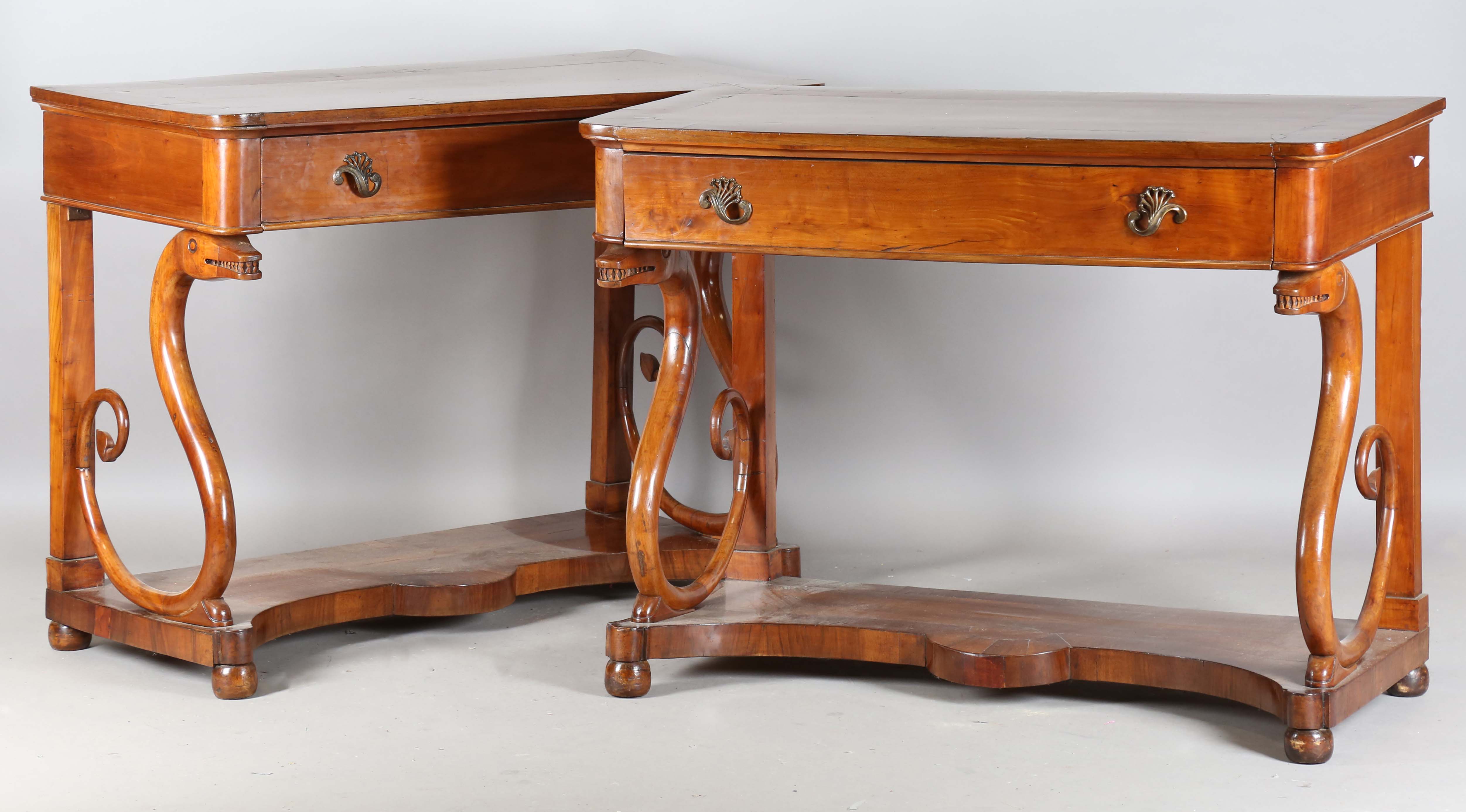 A pair of mid-19th century walnut console tables, probably Italian, each crossbanded top above a single frieze drawer, raised on a pair of finely carved serpent scrolls united by shaped platform bases, height 92cm, width 123cm, depth 58cm.