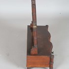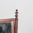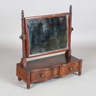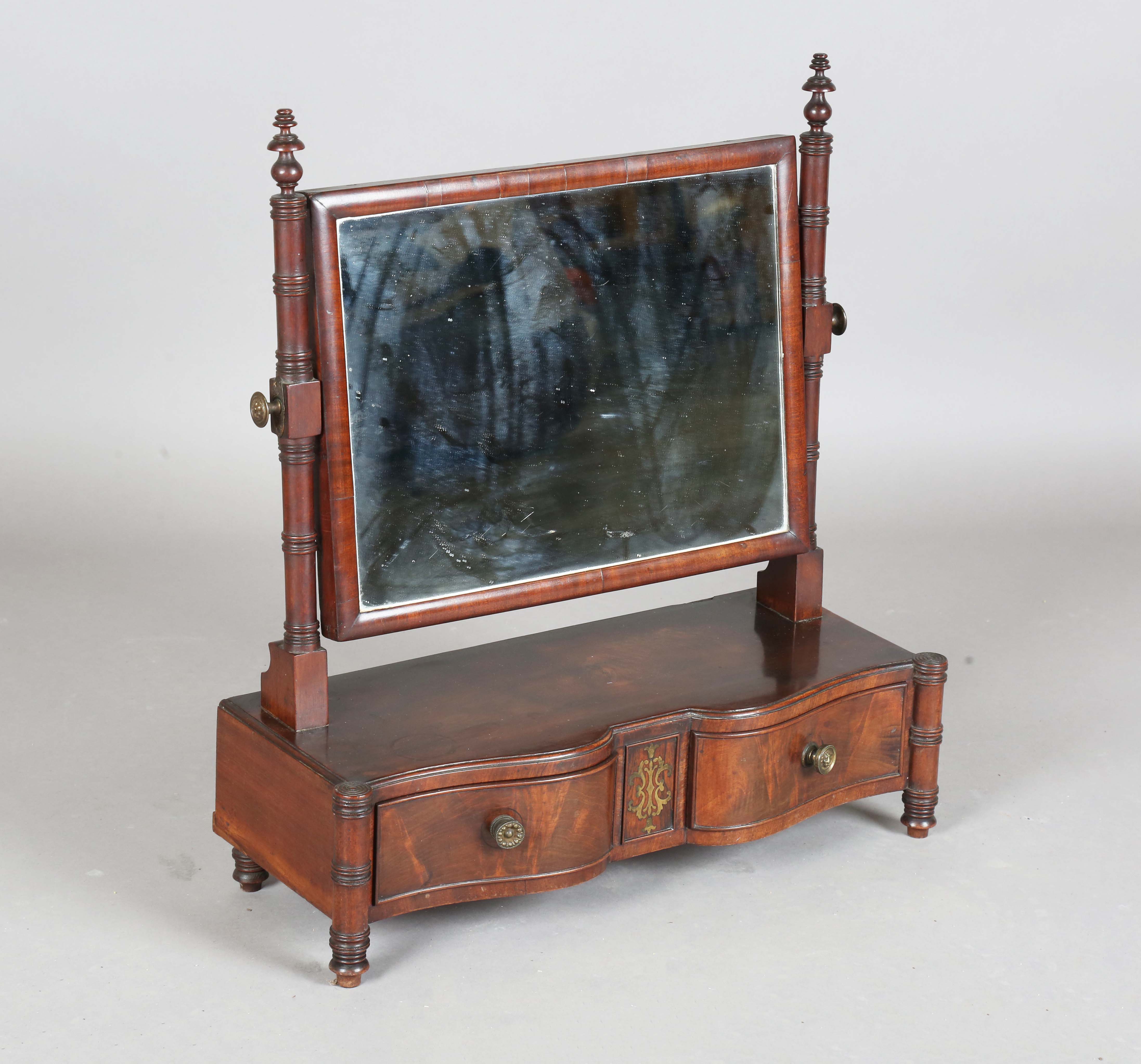 A Regency mahogany and brass inlaid swing frame dressing table mirror, the serpentine base fitted with two drawers, height 61cm, width 53cm, depth 23cm.