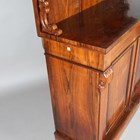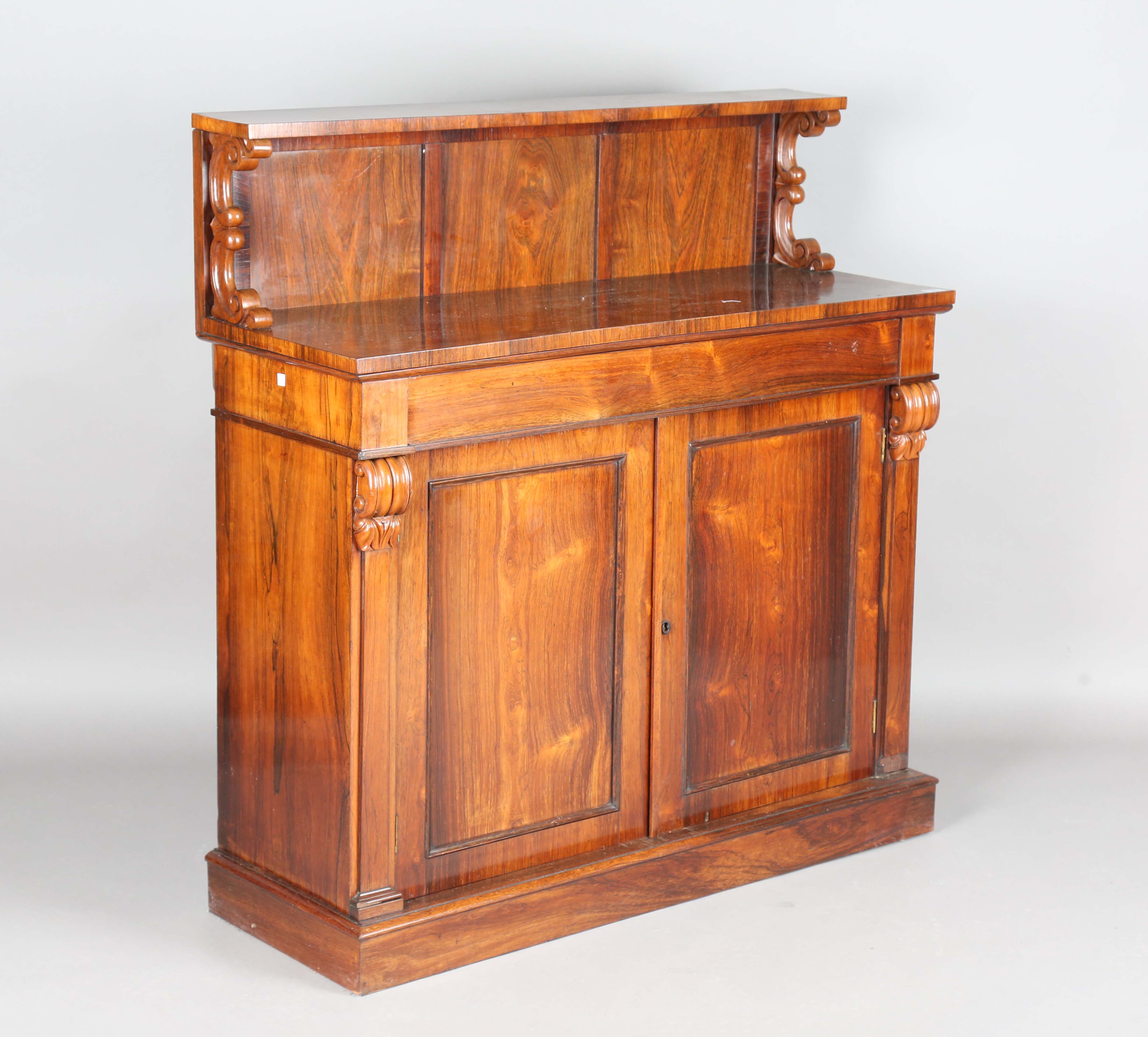 An early Victorian rosewood chiffonier with a shelf back above a drawer and doors, height 120cm, width 115cm, depth 42cm.