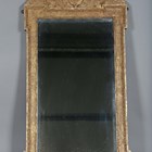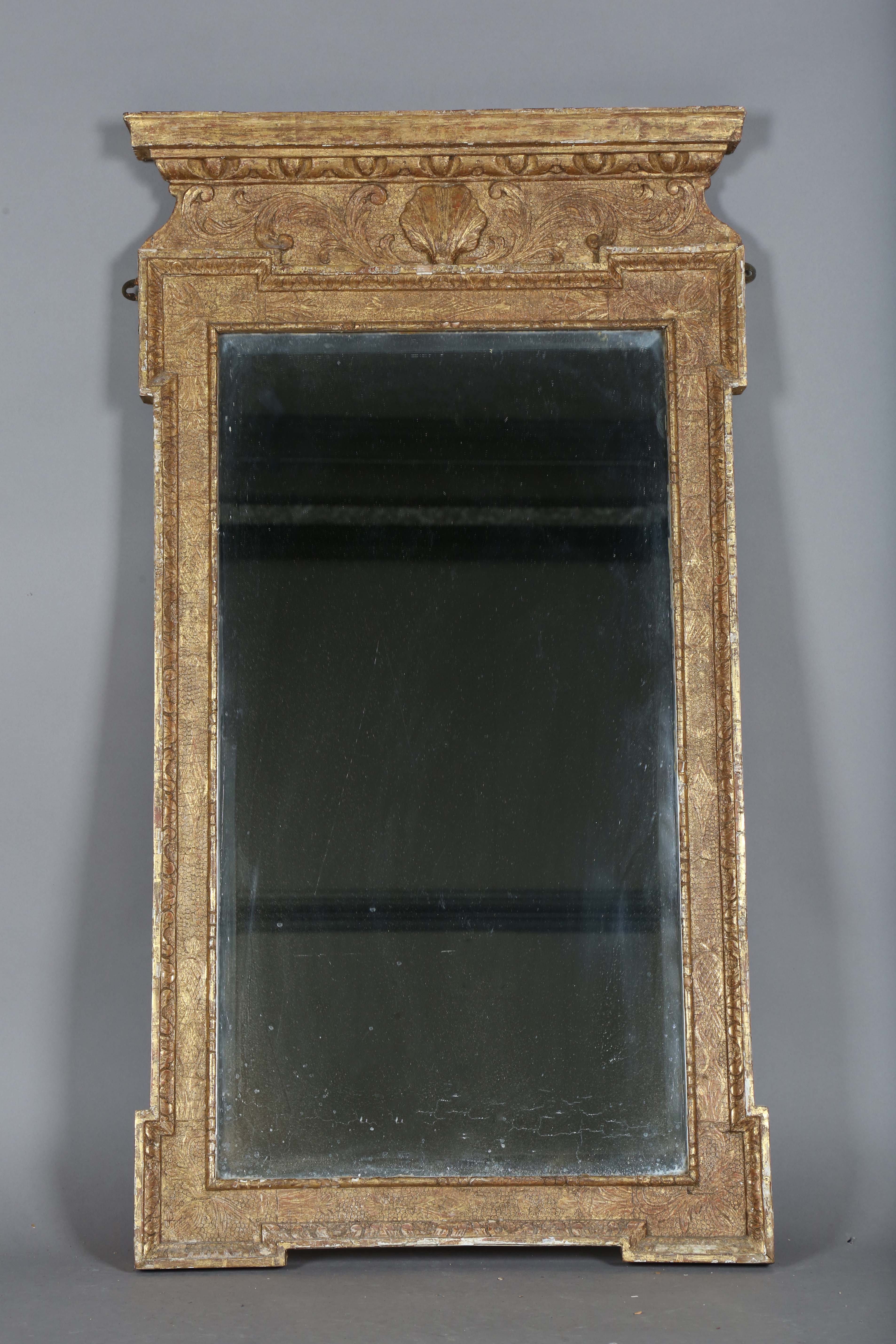 A George II giltwood wall mirror, the shaped pediment with central scallop shell and foliate scroll relief decoration above a rectangular bevelled glass, height 116cm, width 63.5cm.