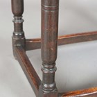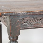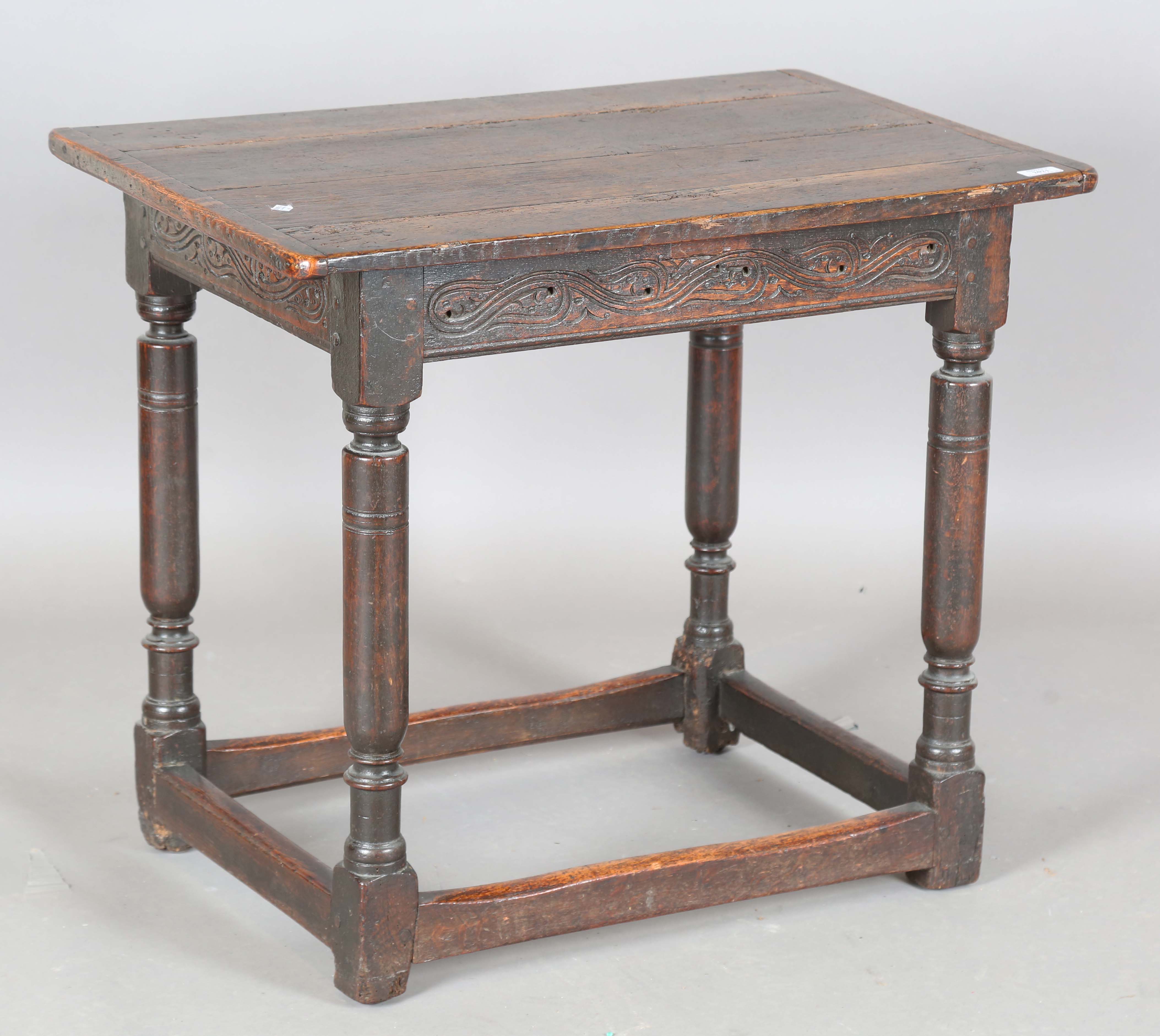 An early 18th century oak rectangular table, on turned and block legs, height 69cm, width 80cm, depth 54cm.