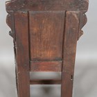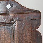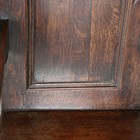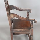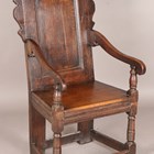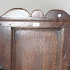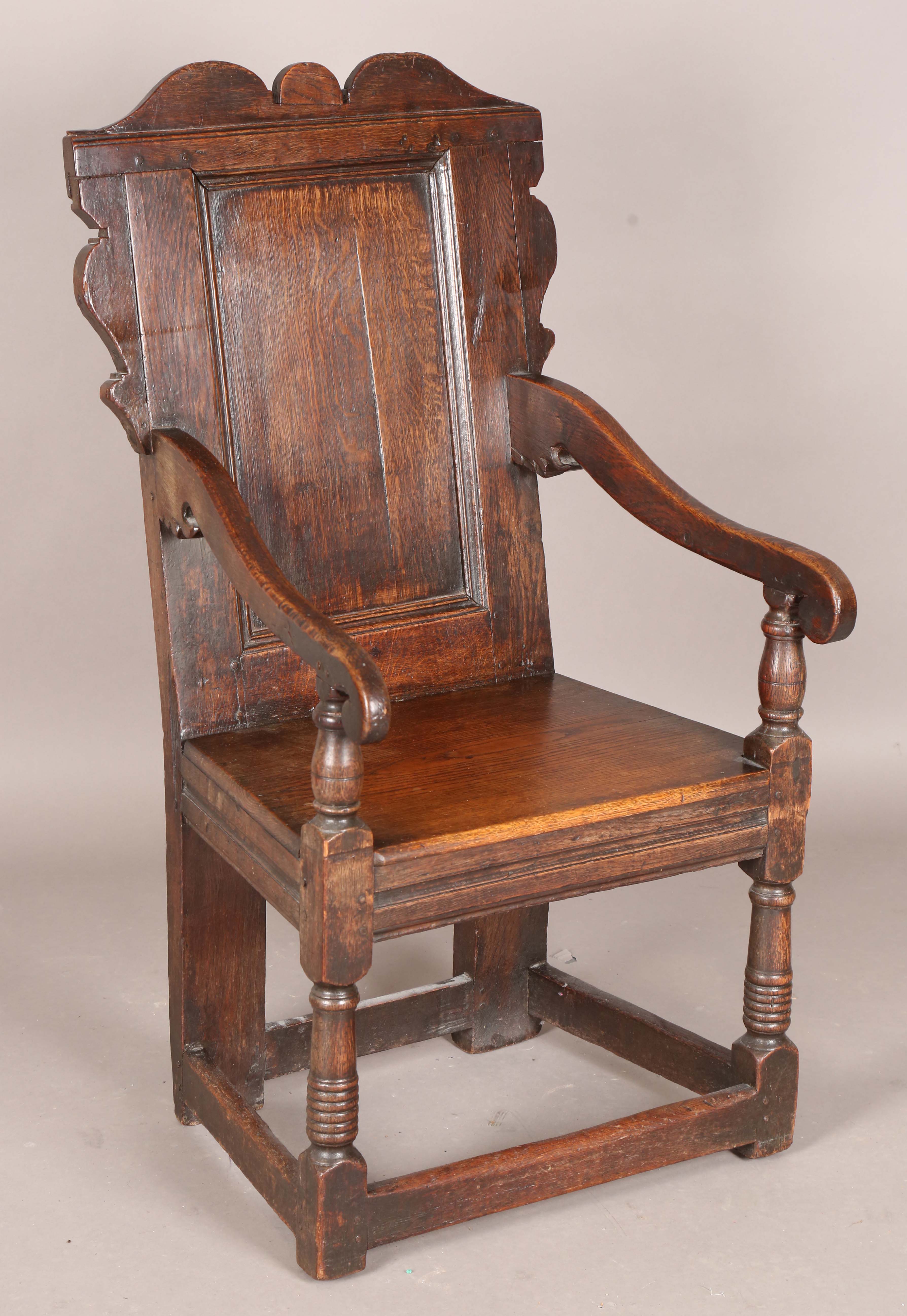 A 17th century and later oak wainscot armchair with a panel back and scroll arms above a later solid seat, height 110cm, width 57cm, depth 60cm (alterations).
