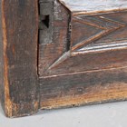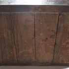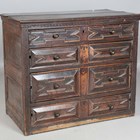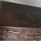 A William and Mary oak chest of four drawers, all with applied geometric mouldings, height 90cm, width 107cm, depth 56cm (alterations and faults).