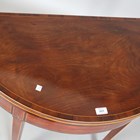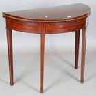 A George III mahogany demi-lune fold-over card table with crossbanded borders and boxwood stringing, height 73cm, width 92cm, depth 45cm.