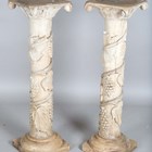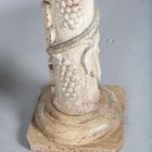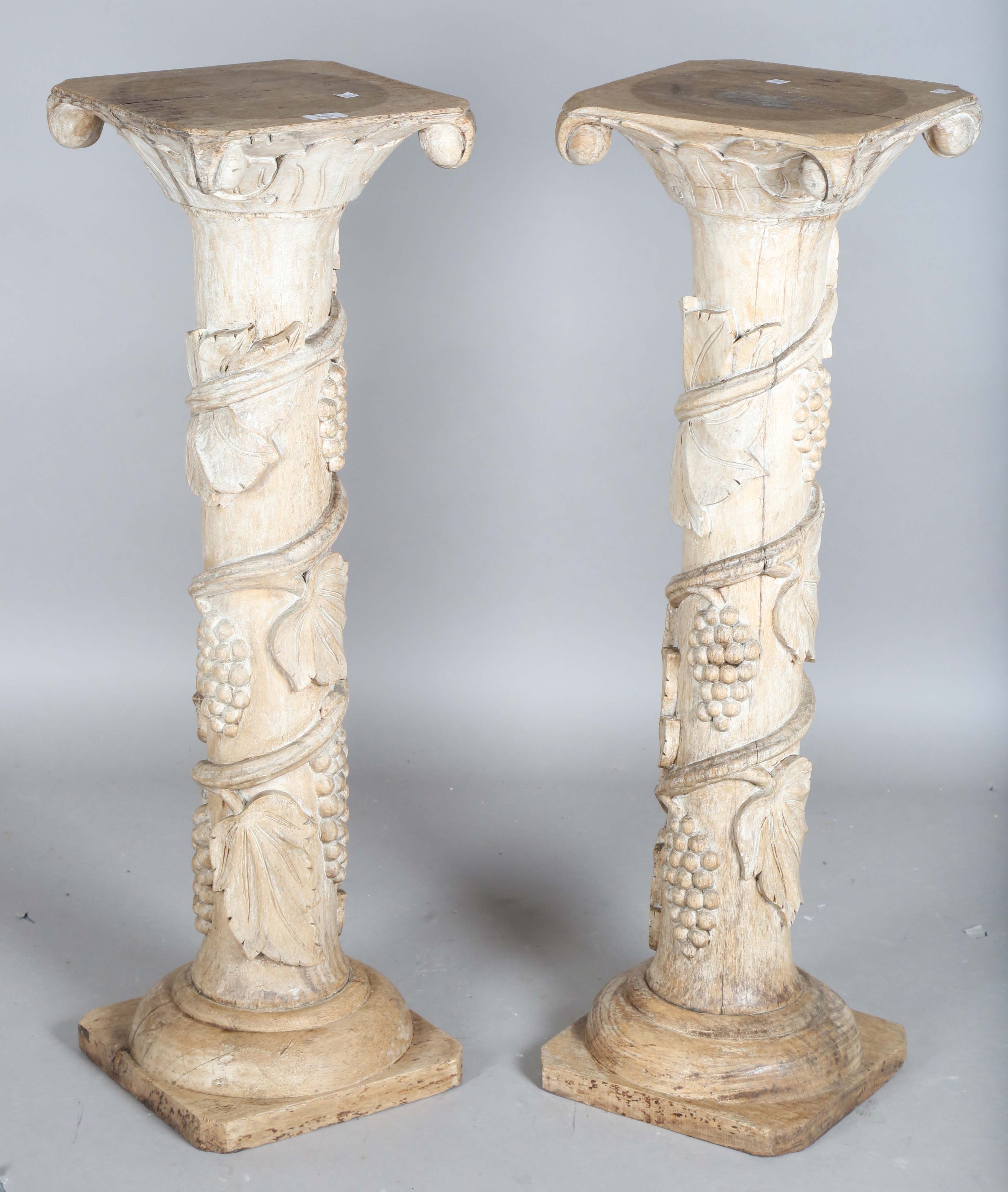 A pair of 20th century carved wooden display pedestals, the shafts decorated in relief with grapes and vine leaves, height 100cm, width 30cm.
