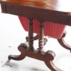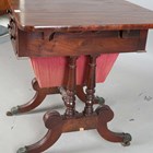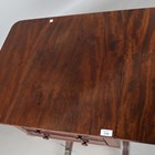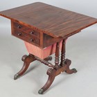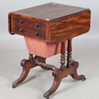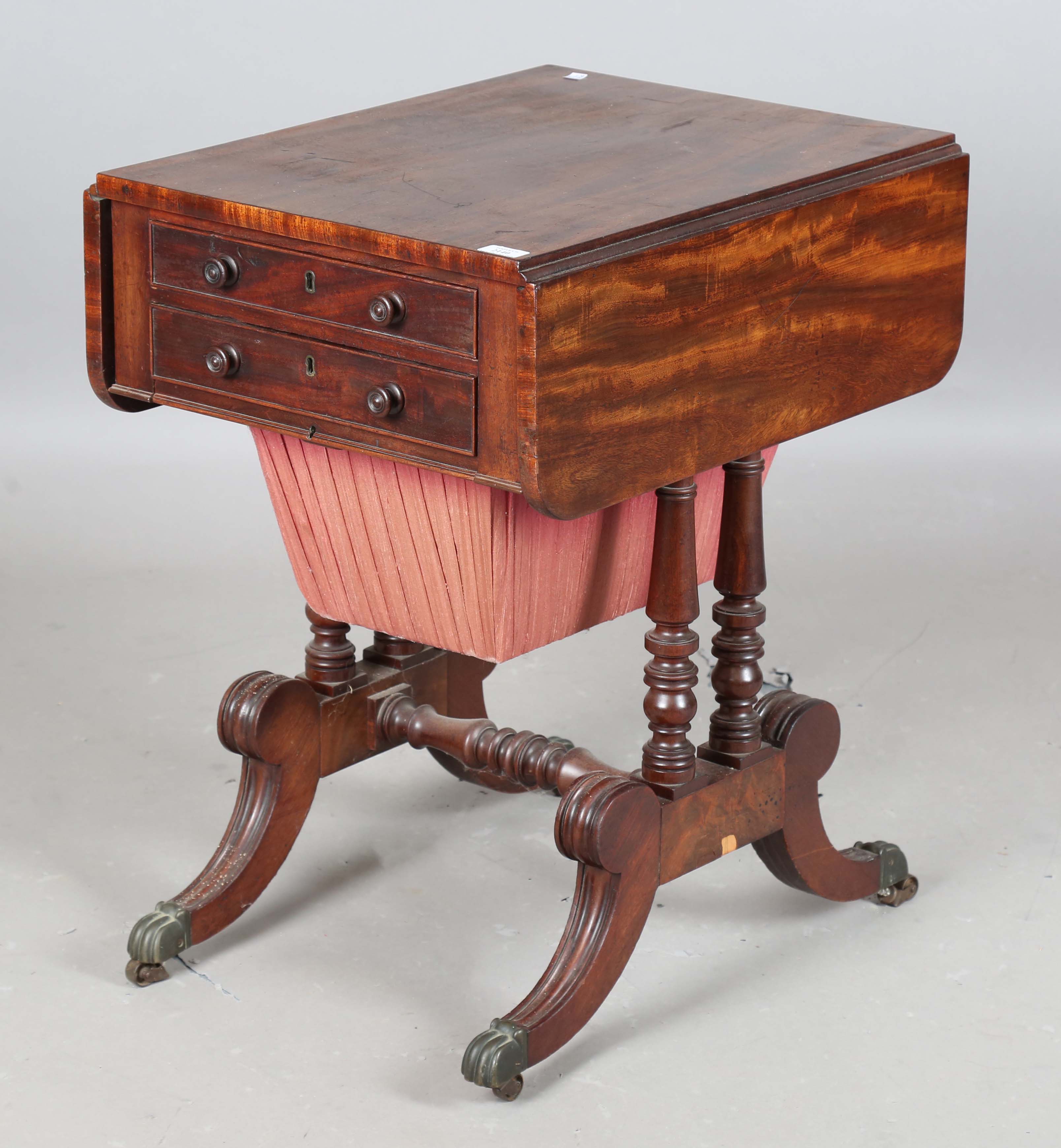 A Regency mahogany drop-flap work table, in the manner of Gillows of Lancaster, fitted with two frieze drawers, on turned supports and downswept legs, height 74cm, width 45cm, depth 60cm.