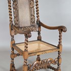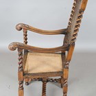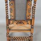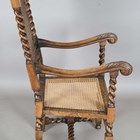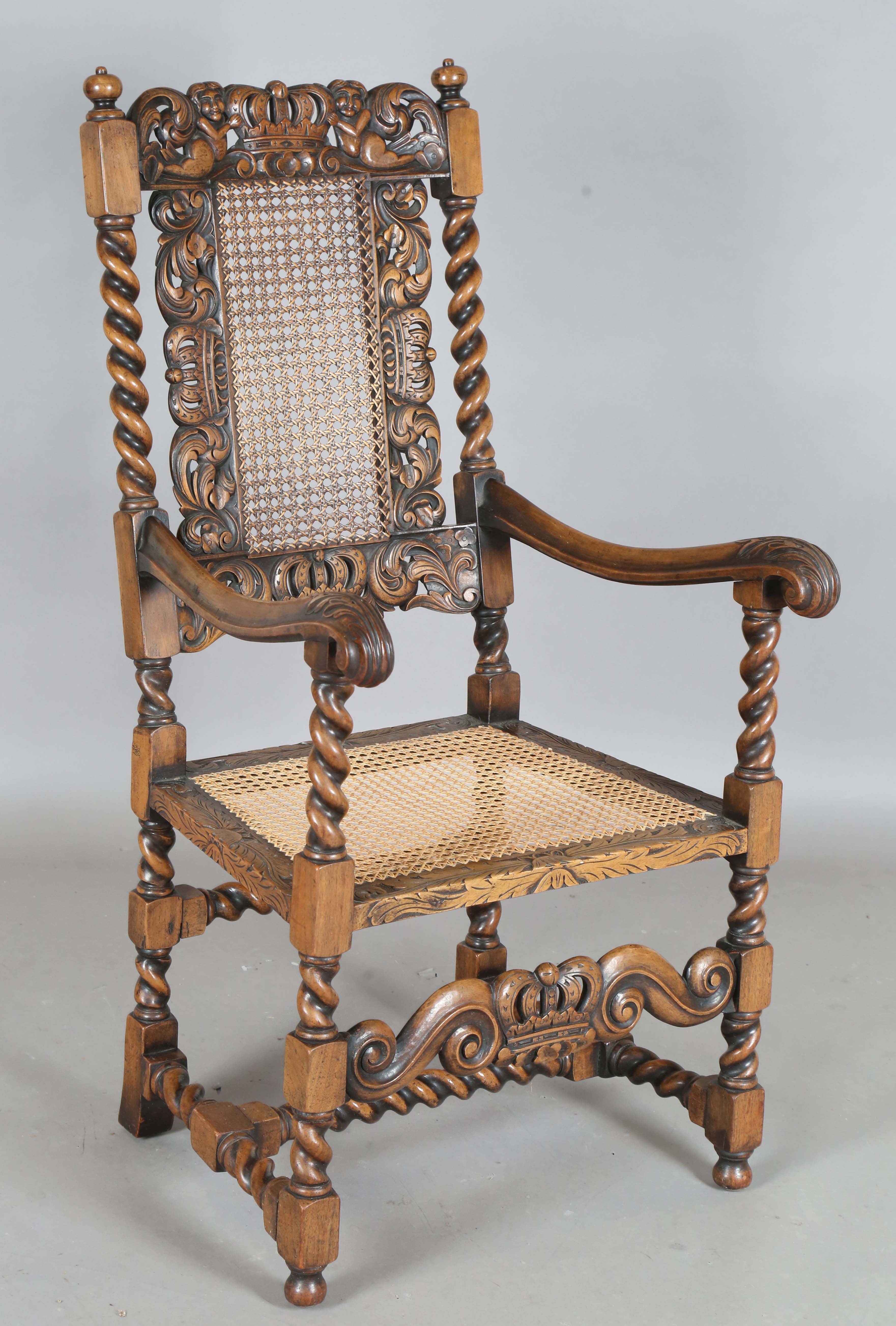 An early 20th century Carolean Revival walnut armchair, the profusely carved frame with caned seat and back, height 120cm, width 62cm, depth 67cm.