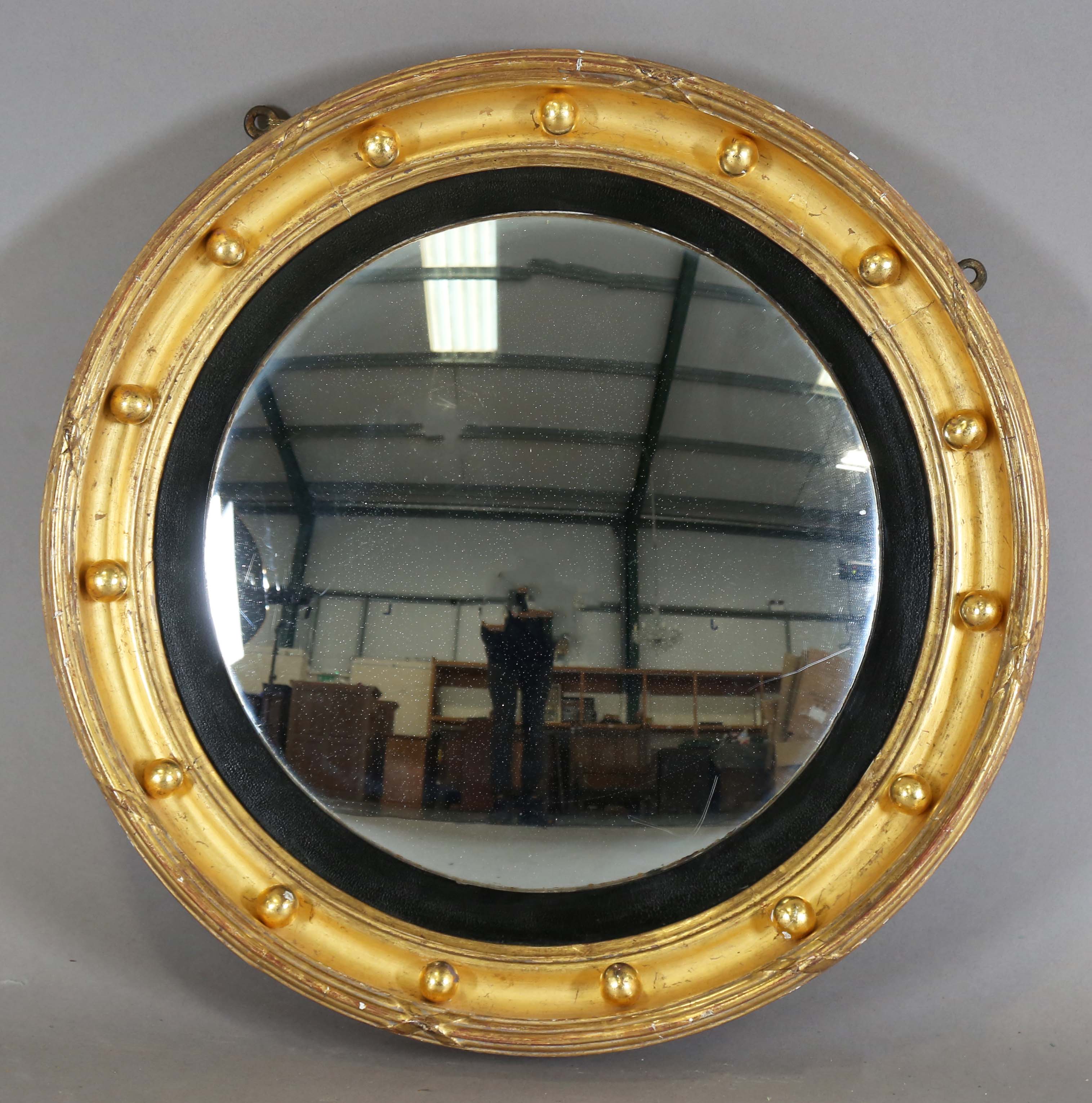 A Regency gilt gesso convex wall mirror with a ballshot border, diameter 46cm.