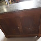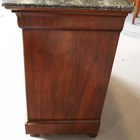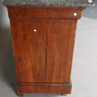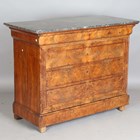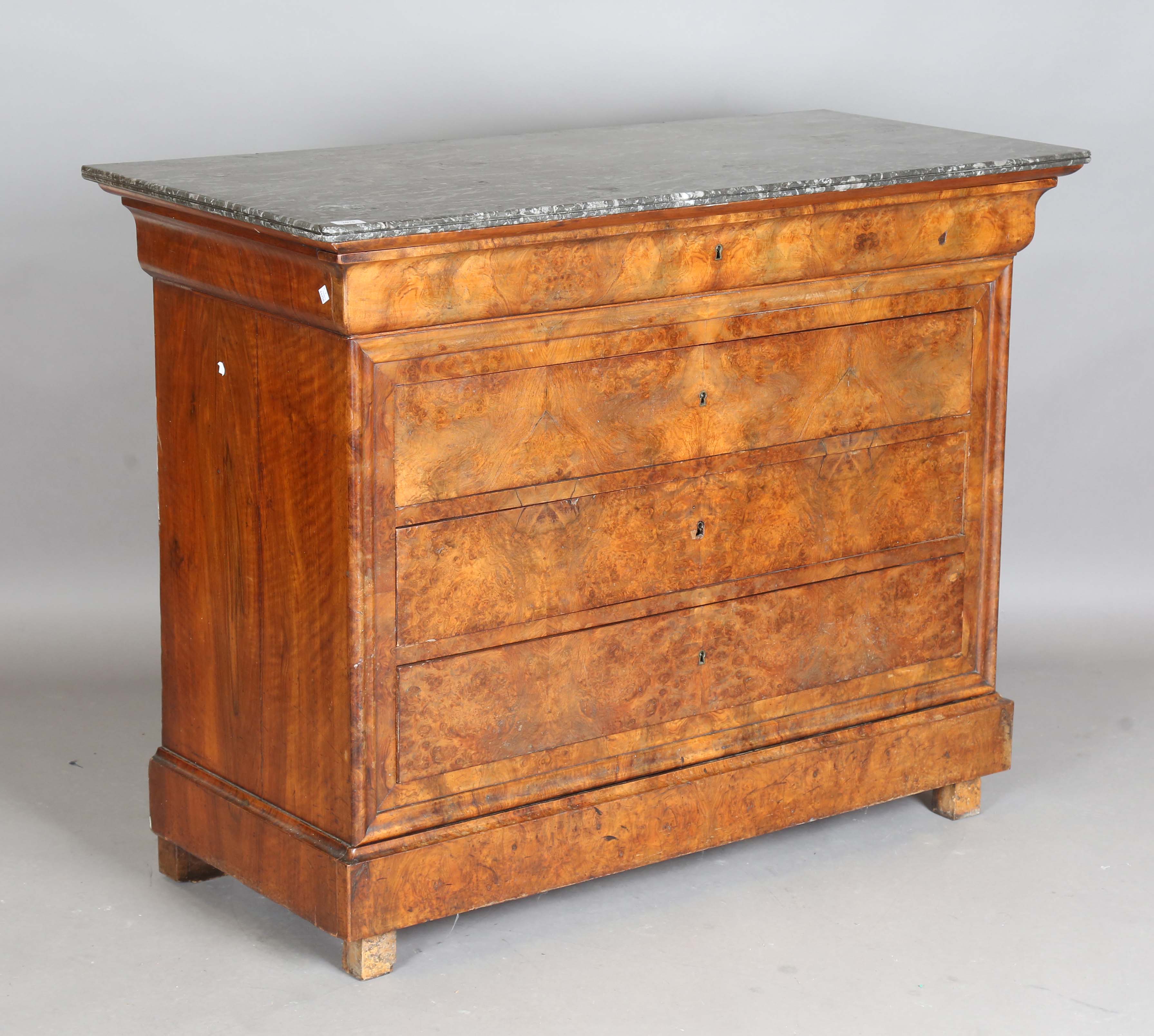 A French Louis Philippe walnut commode with grey veined marble top above four drawers, height 99cm, width 129cm, depth 57cm.