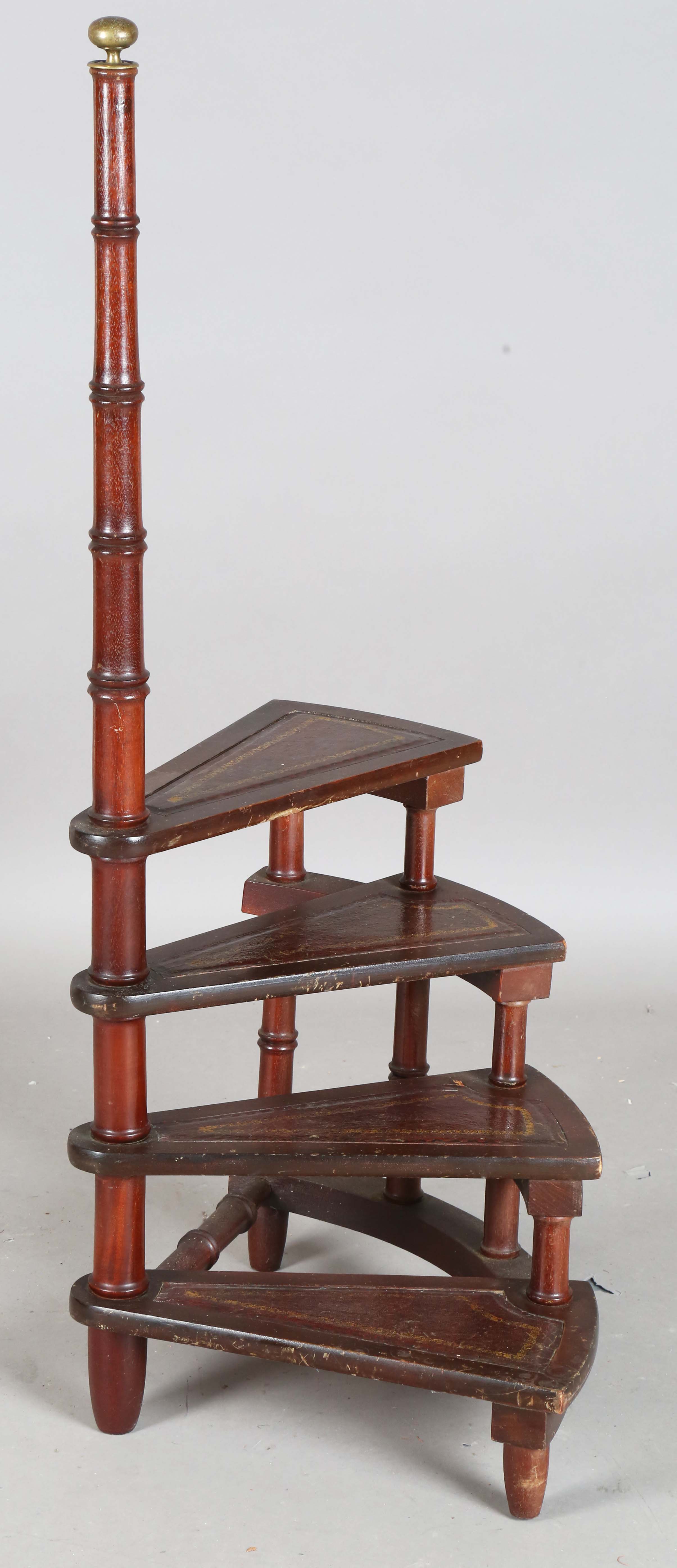 A set of late 20th century reproduction mahogany spiral library steps with brass finial and leather inset steps, height 117cm, width 42cm.