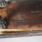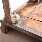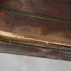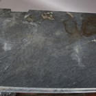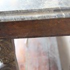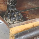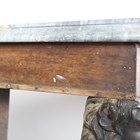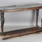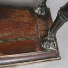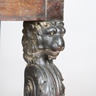 A Regency mahogany bowfront console table, in the manner of Thomas Hope, the grey marble top above a plain frieze, raised on a pair of carved lion-headed monopodia and carved acanthus rear supports, united by a brass inlaid platform base, height 85.5cm, width 151cm, depth 43cm (faults, lacking sections of plinth).