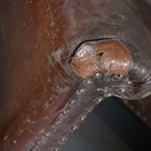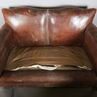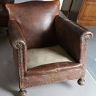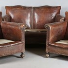 An early 20th century brown leather and brass studded three-piece suite, comprising a settee, height 78cm, width 131cm, depth 70cm, and a pair of armchairs, height 78cm, width 78cm, depth 70cm (faults).