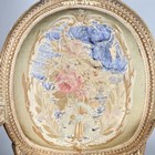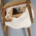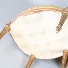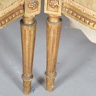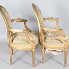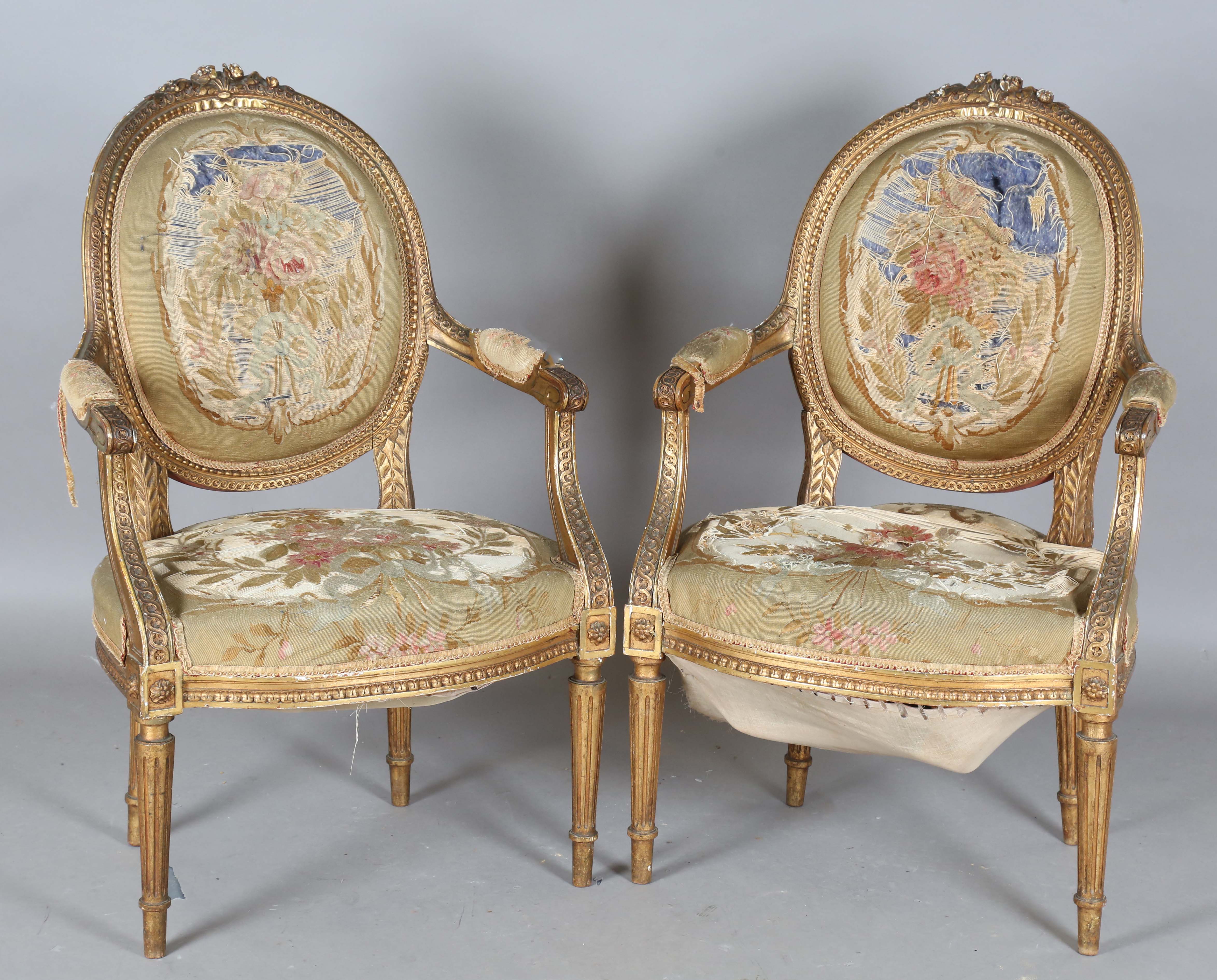 A pair of late 19th/early 20th century giltwood showframe fauteuil armchairs, the seats and backs with the remnants of period tapestry, height 94cm, width 60cm, depth 60cm.