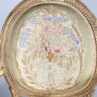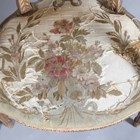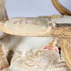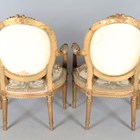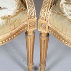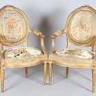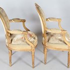 A pair of late 19th/early 20th century giltwood showframe fauteuil armchairs, the seats and backs with the remnants of period tapestry, height 94cm, width 60cm, depth 60cm.