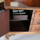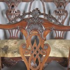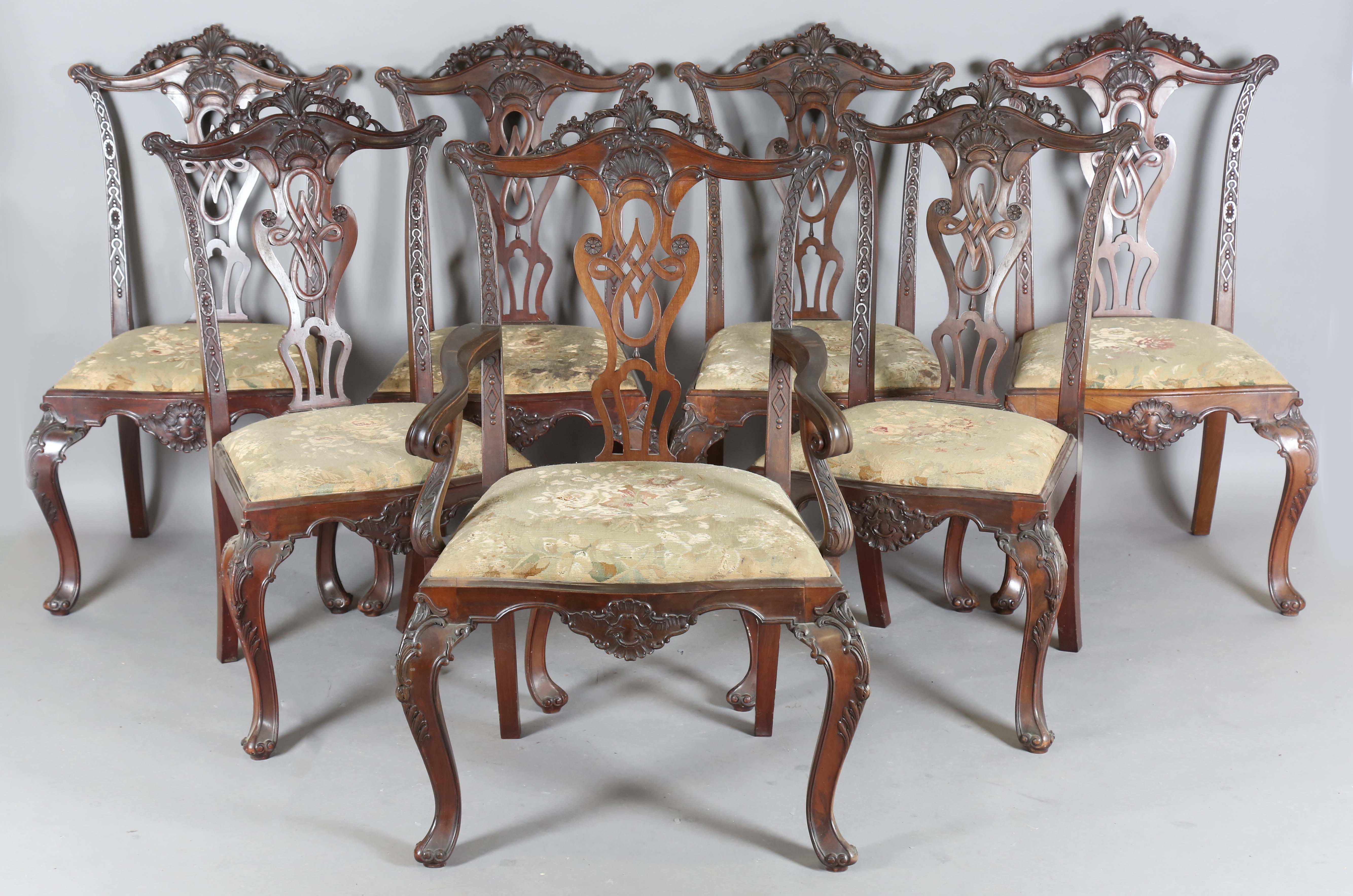 A set of seven early 20th century Chippendale style mahogany dining chairs with finely carved backs and drop-in seats, comprising a carver, height 112cm, width 70cm, and six standards, height 108cm, width 60cm, together with a similar extending dining table, extended length 198cm, depth 107cm, and a sideboard, width 183cm.