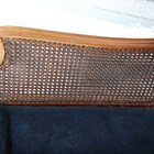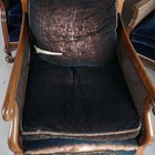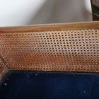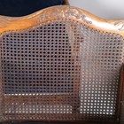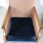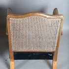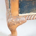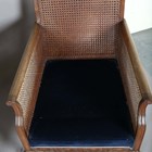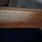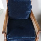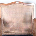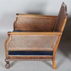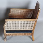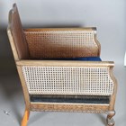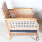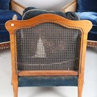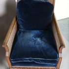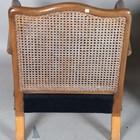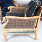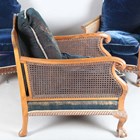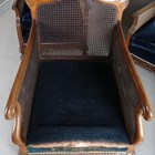 A pair of early 20th century mahogany bergère armchairs, upholstered in blue velour, height 84cm, width 69cm, depth 82cm, together with a similar chair, height 90cm, width 74cm.