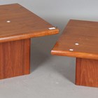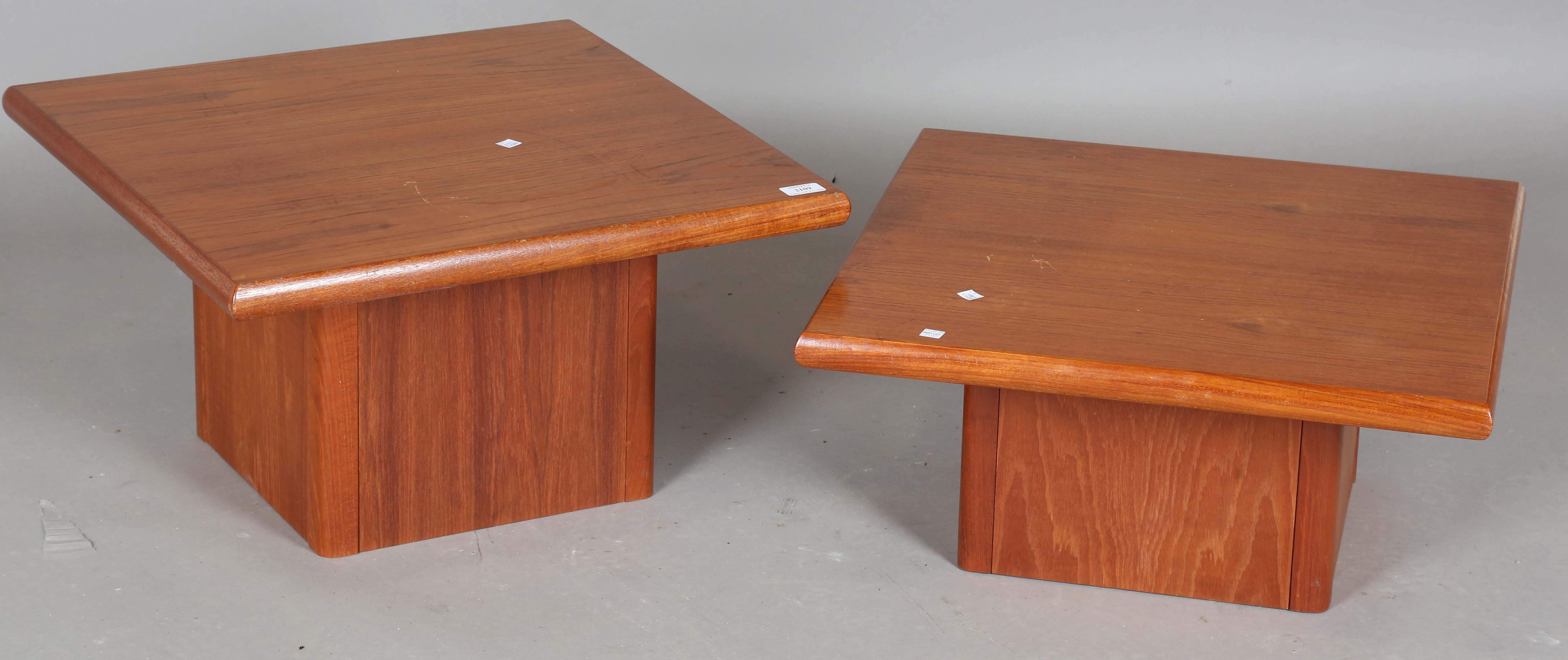 A graduated pair of mid-20th century teak coffee tables, height 32cm, width 58cm x 58cm and height 26cm, width 58cm x 58cm.