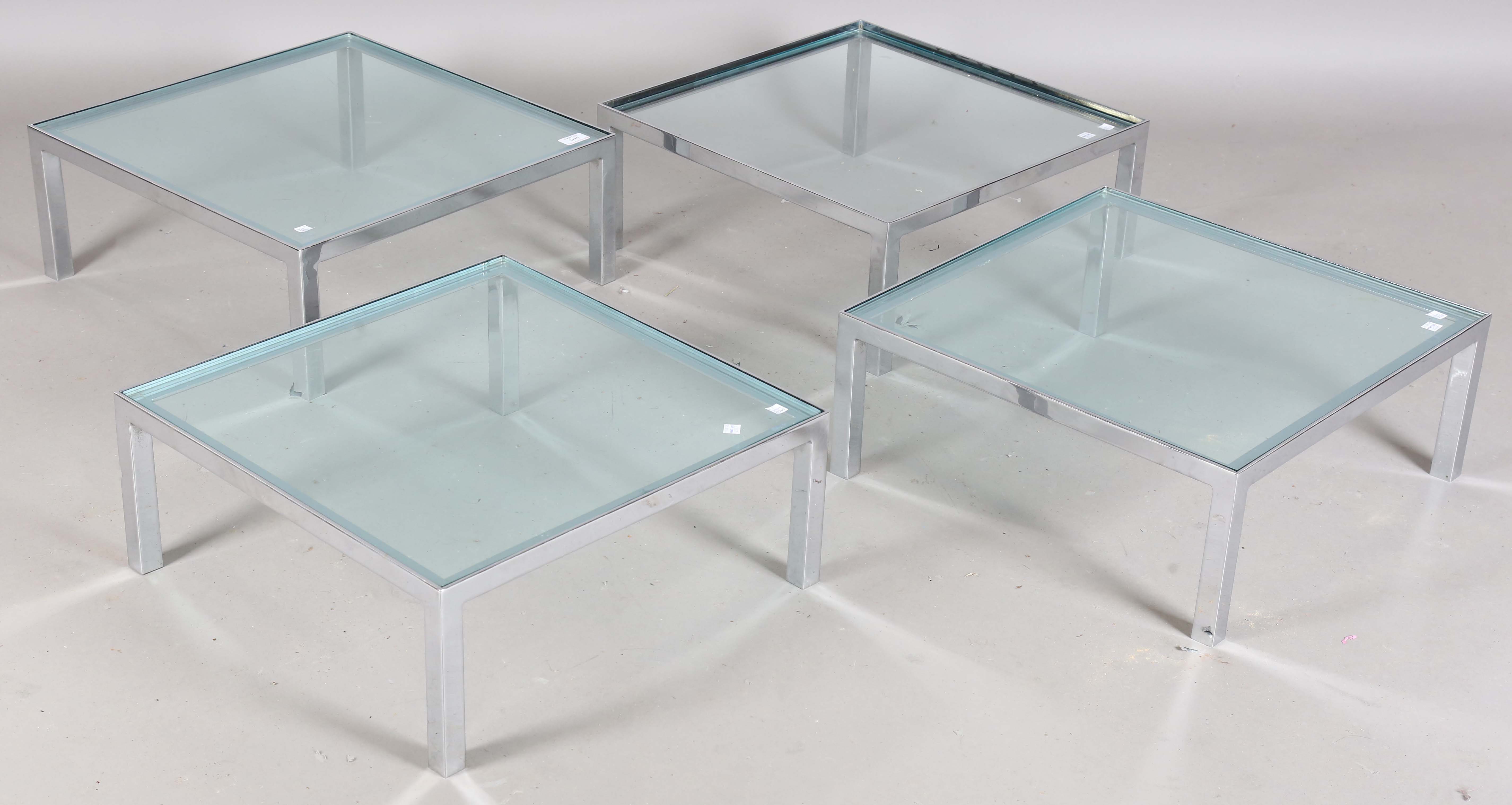 A set of four mid-20th century chromium plated metal framed and glass-topped modular coffee tables, in the manner of Milo Baughman, each table height 20cm, width 51cm.