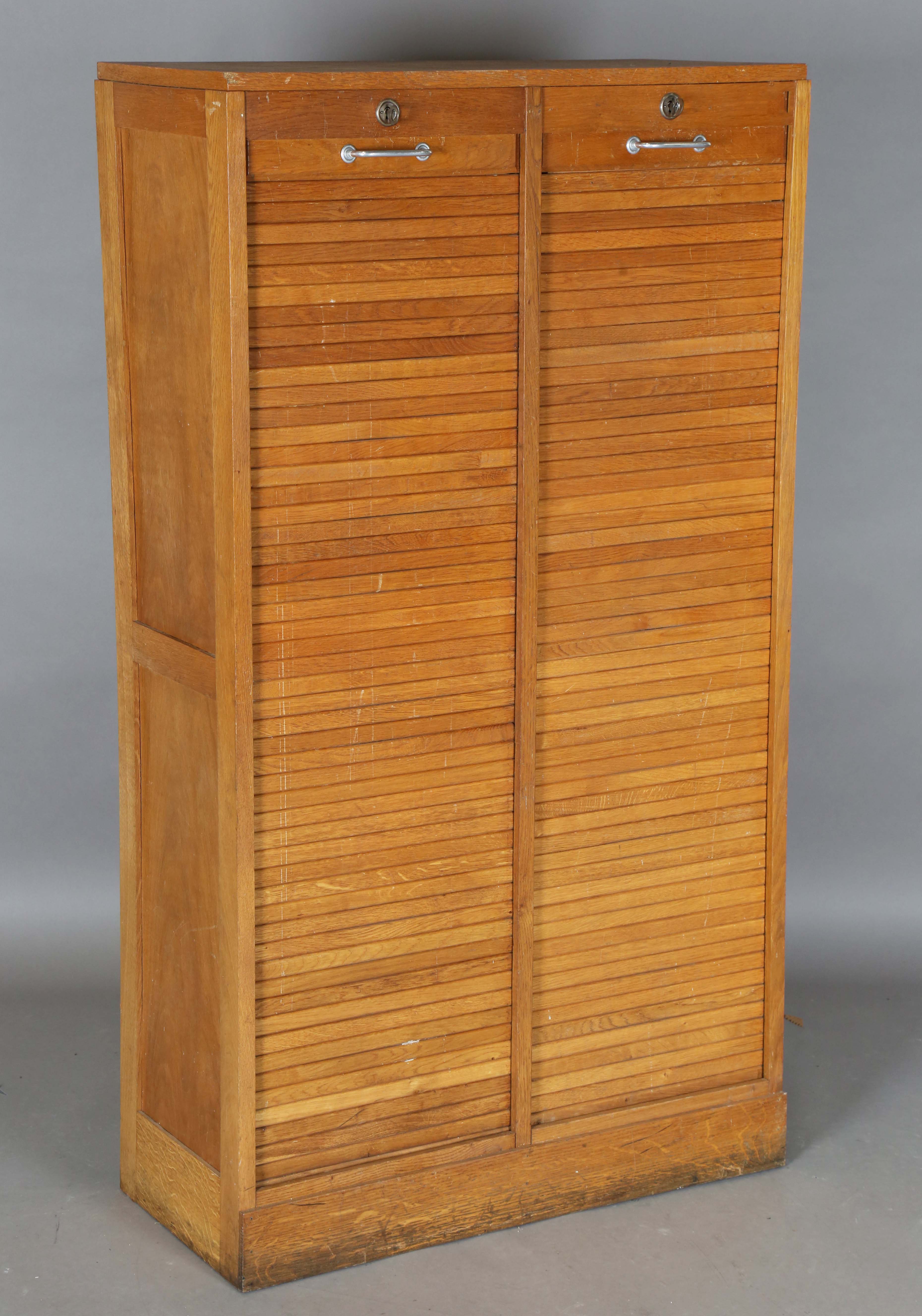 A 20th century oak tambour twin-door filing cabinet, height 150cm, width 84cm, depth 36cm.