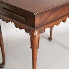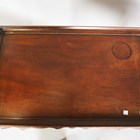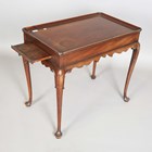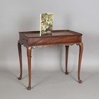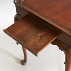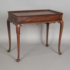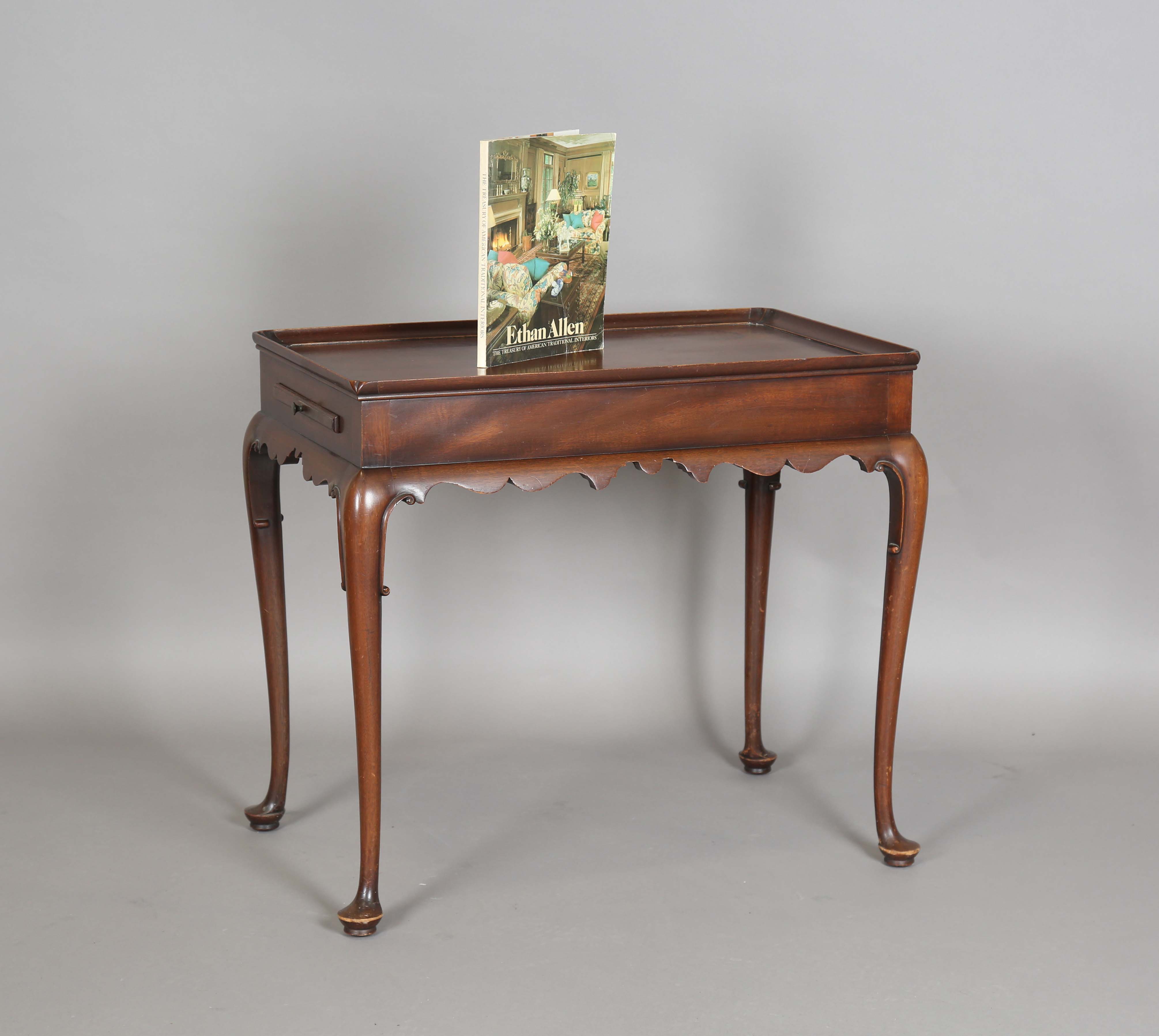 A mid/late 20th century George II style mahogany tea table by Ethan Allen, the galleried top above two end slides, on cabriole legs, height 67cm, width 76cm, depth 48cm.