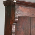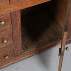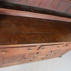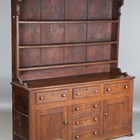 A George III provincial oak dresser, the plate rack above three drawers and two doors flanking three dummy drawers, height 191cm, width 158cm, depth 47cm.