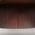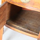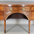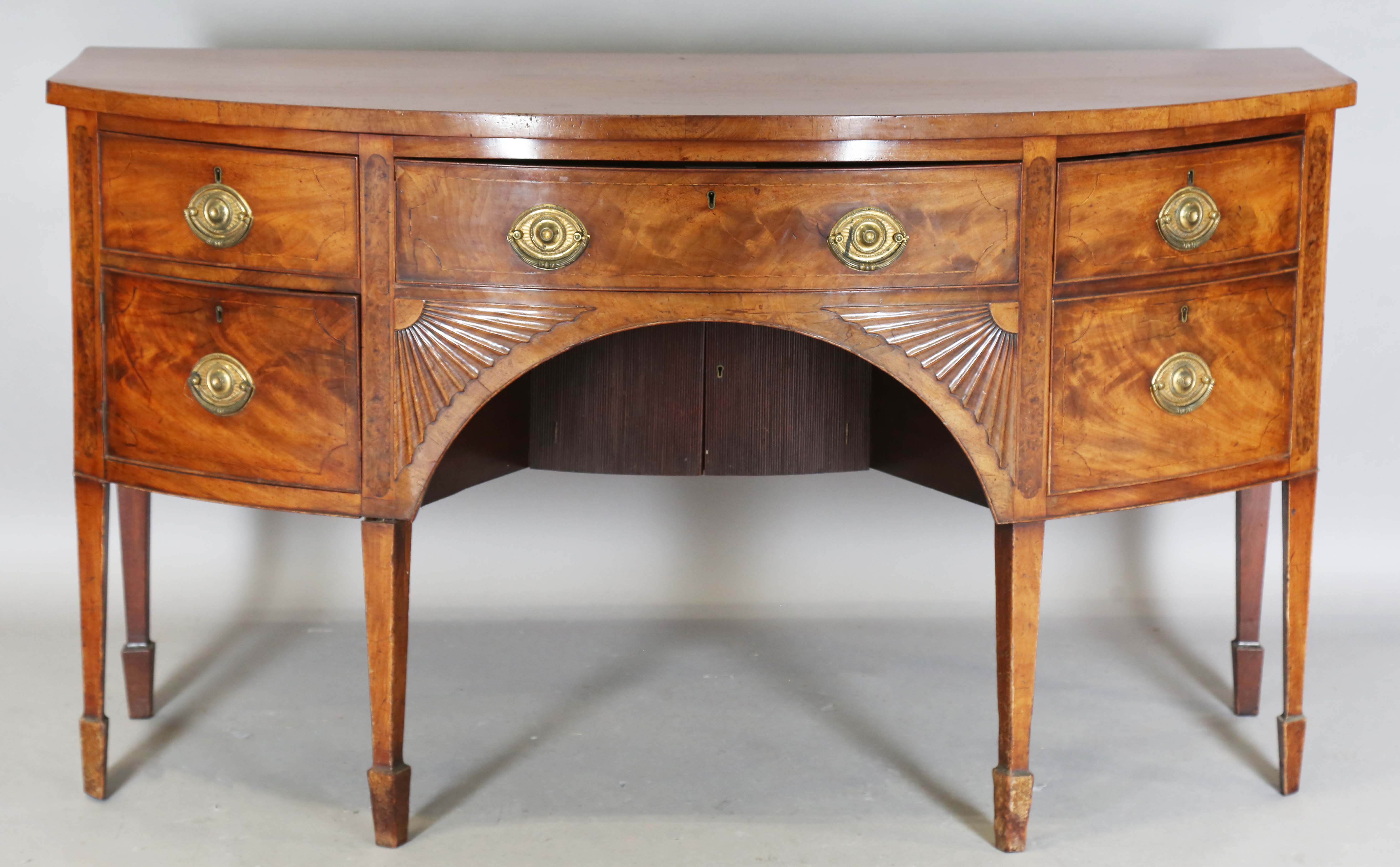 A good George III mahogany bowfront sideboard, the oak-lined drawers and cupboards within vertical reserves of burr yew, the central recess with finely carved fan spandrels and a small lower cupboard, height 94cm, width 167cm, depth 73cm.
