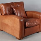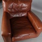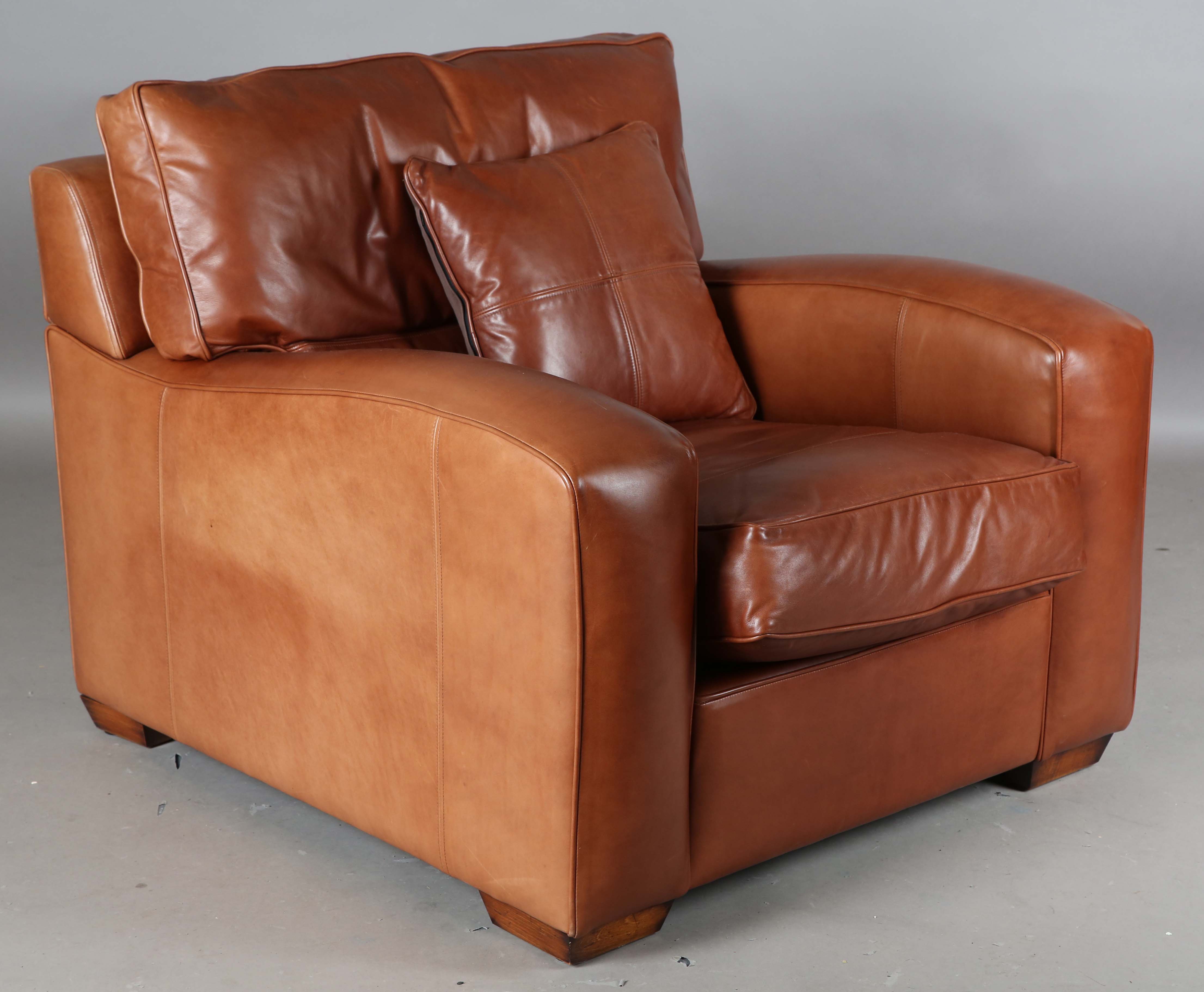 A modern Duresta 'Panther' brown leather armchair with feather-filled cushions, height 74cm, width 96cm, depth 110cm.