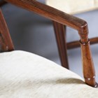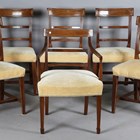 A set of five Regency mahogany bar back dining chairs with crossbanded borders, height 88cm, width 52cm, together with a similar matched carver chair, height 83cm, width 58cm.