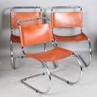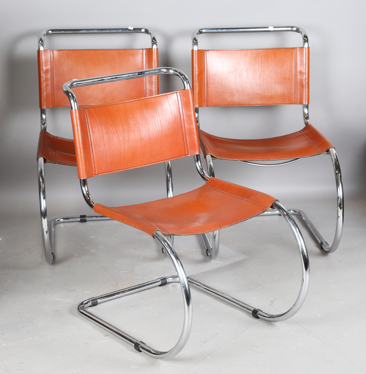 A group of three late 20th century 'MR10' chairs, designed by Ludvig Mies van der Rohe for Thonet, each tubular cantilever frame supporting tan leather seats and backs, height 85cm, width 49cm, depth 73cm.