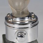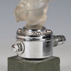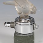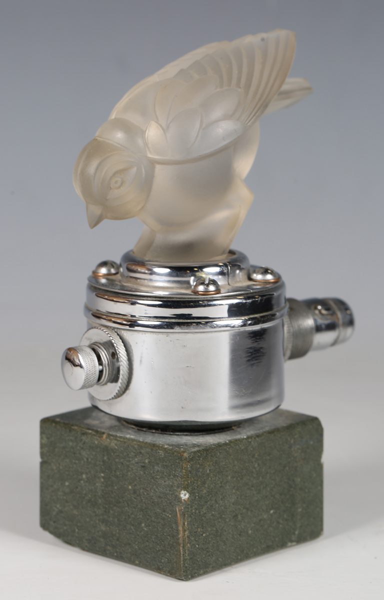 A Red Ashay satin glass car mascot, moulded in the form of a bird, mounted to its chromium plated illuminating base and a hardstone plinth, total height 15.8cm. Note: Red Ashay mascots were made for H.G. Ascher Ltd of Manchester and London, by the Reidel Glass Works in Czechoslovakia. H.G. Ascher first marketed these mascots as ‘Red Ashay’ in 1930 and they were finally taken off the market in 1952, when H.G. Ascher closed.