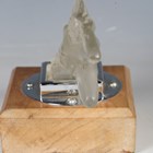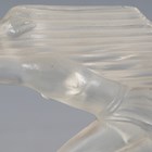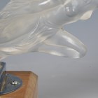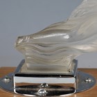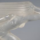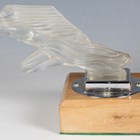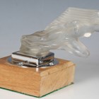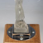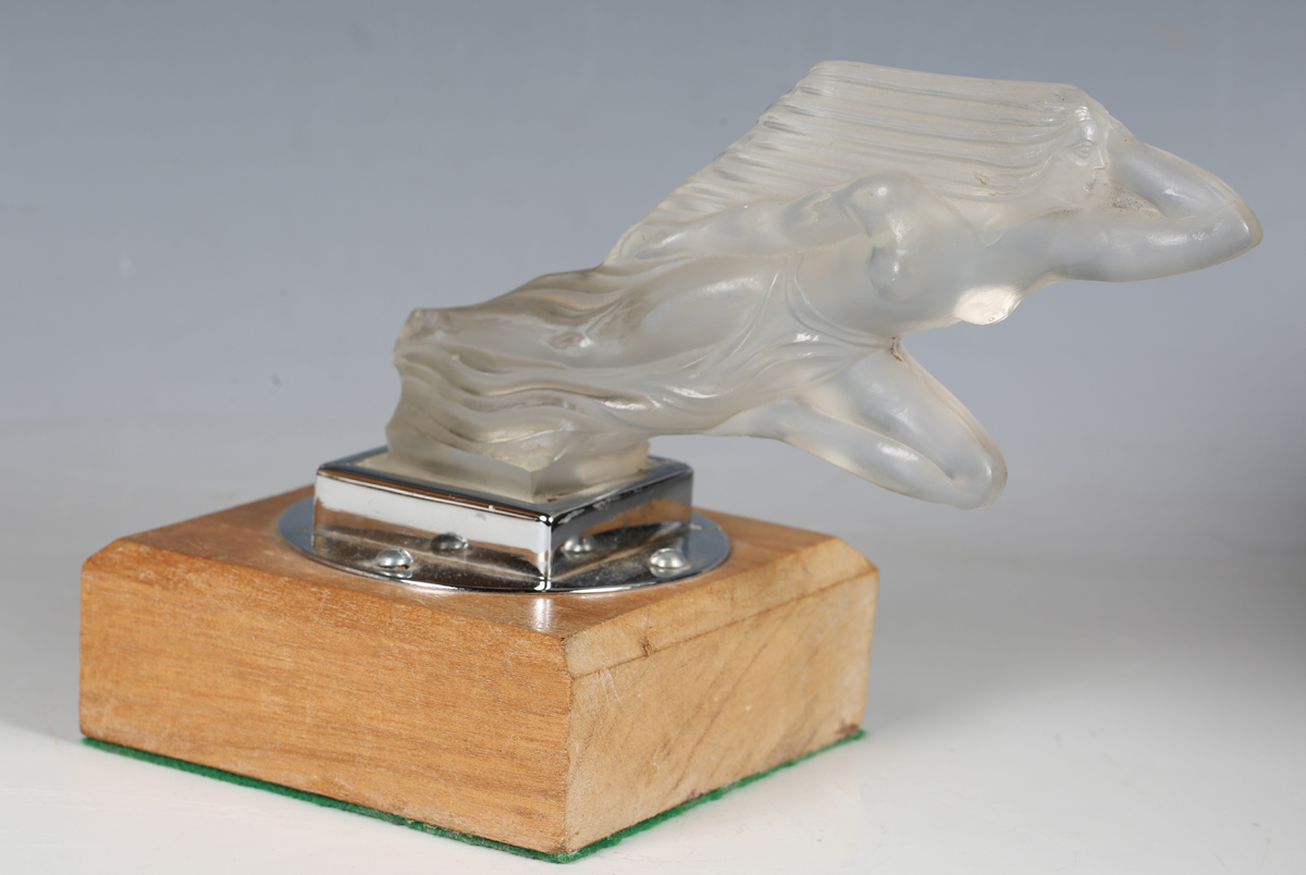 A Red Ashay satin glass 'Acceleration' pattern car mascot, moulded in the form of a nude maiden leaning forward, her hair and loin cloth trailing behind her, mounted to a chromium plated base and wooden plinth, length of mascot 20cm. Note: Red Ashay mascots were made for H.G. Ascher Ltd of Manchester and London, by the Reidel Glass Works in Czechoslovakia. H.G. Ascher first marketed these mascots as ‘Red Ashay’ in 1930 and they were finally taken off the market in 1952, when H.G. Ascher closed.