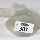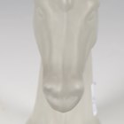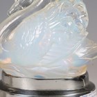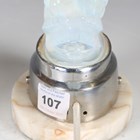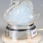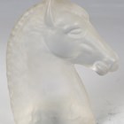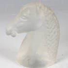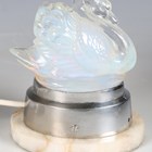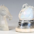 A French opalescent moulded glass car mascot in the form of a swan, mounted to an illuminated base and onyx plinth, length 12cm, together with a Swedish satin glass horse's head by Reijmyre, height 13cm.