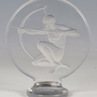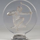 A Lalique moulded glass 'The Archer' car mascot, model No. 1126, introduced in 1926, etched 'R. Lalique France', raised on a circular base, height 12.2cm.